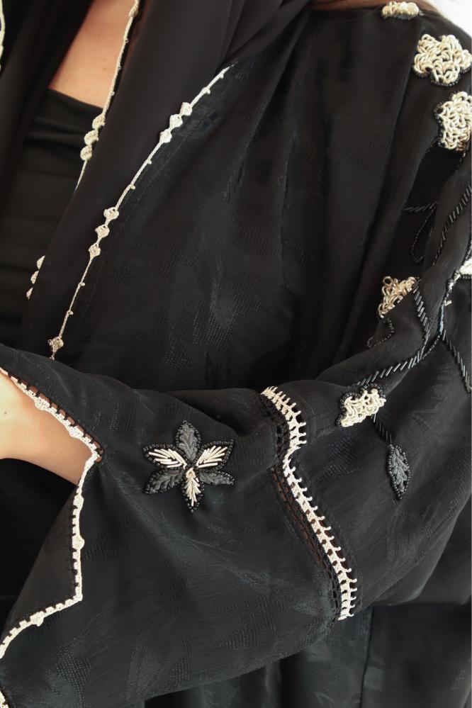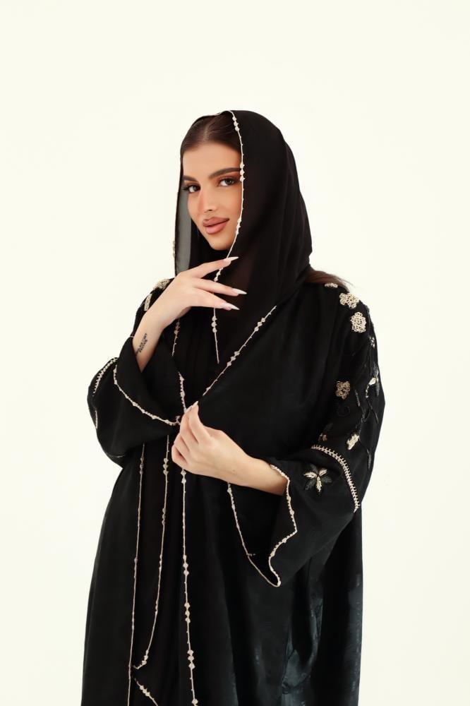 تصميم يعكس الأناقة بكل تفاصيله. عباية Elegant Lady مصممة من قماش جاكار فاخر، بتطريز يدوي ذهبي دقيق يزيّن الأكتاف والأكمام بخيوط كروشيه ناعمة. قصة مفتوحة وانسيابية، تضيف لمسة أنثوية فخمة، مثالية للظهور المميز في المناسبات.