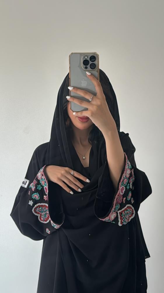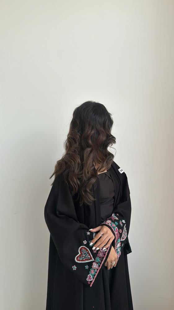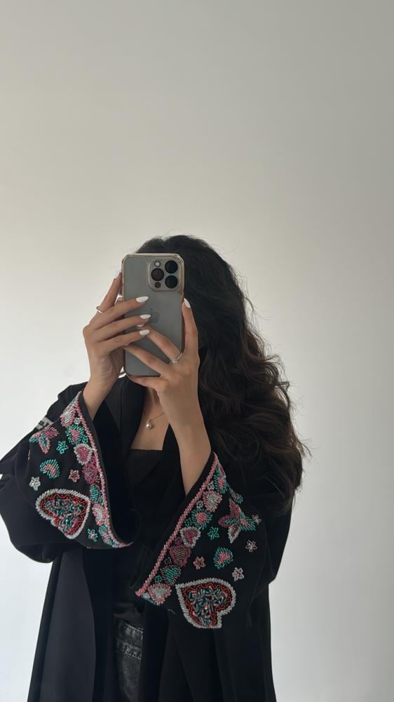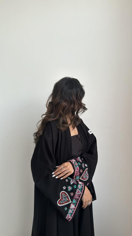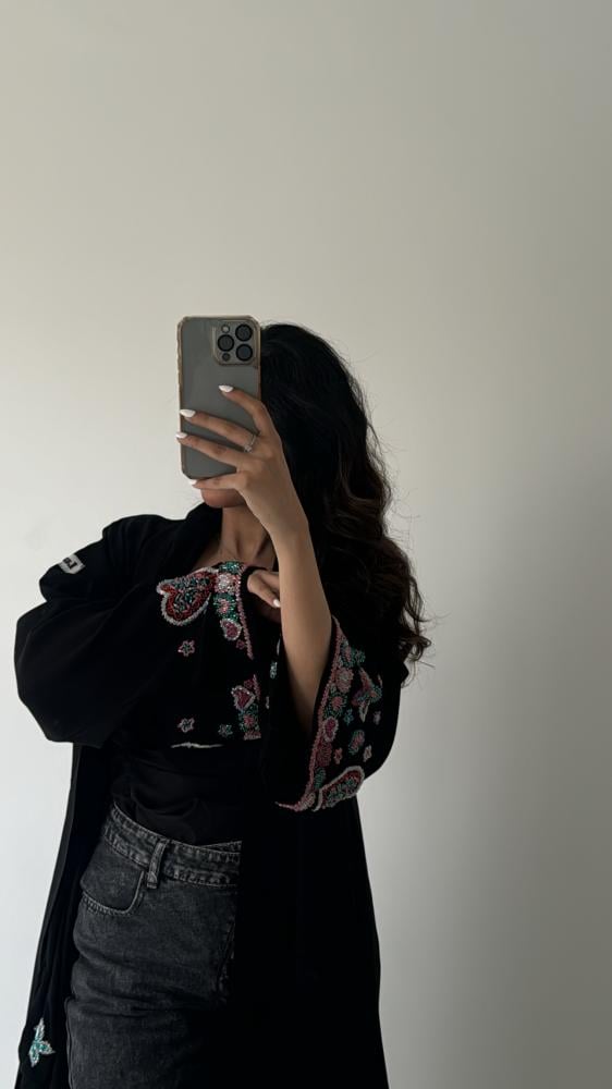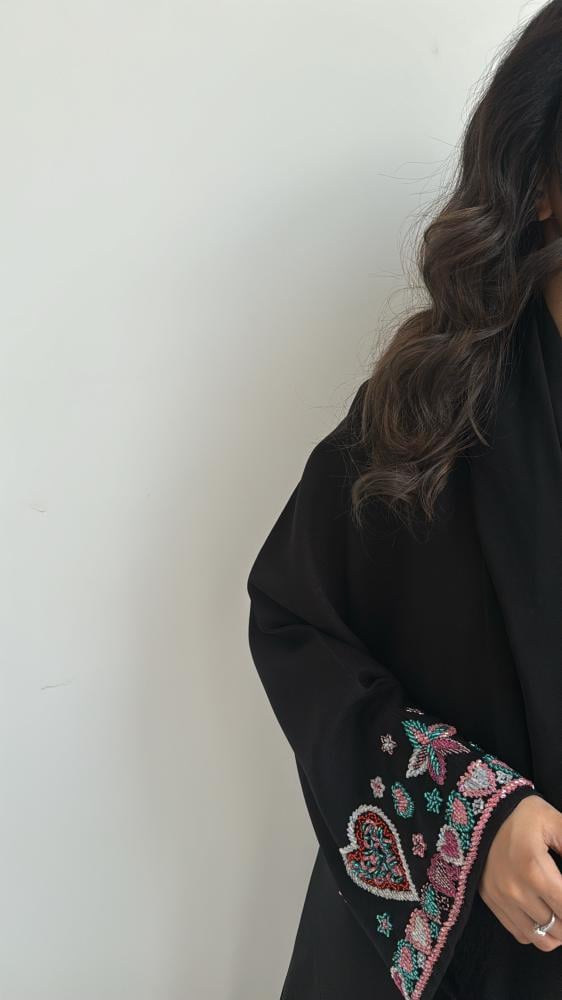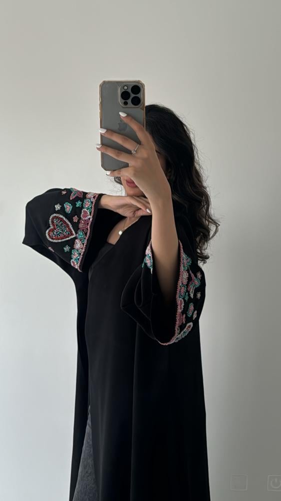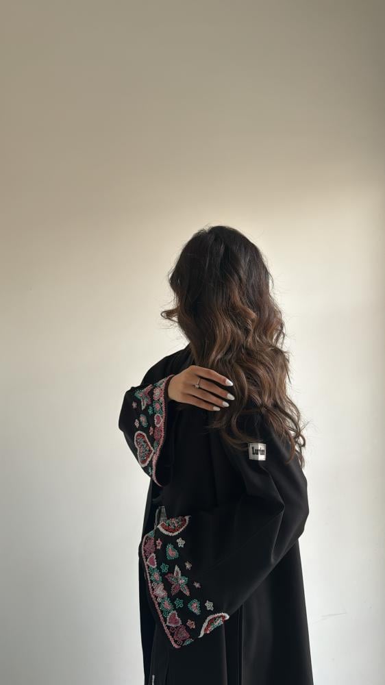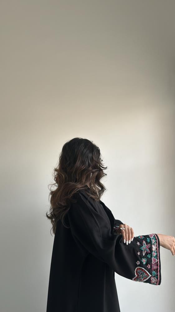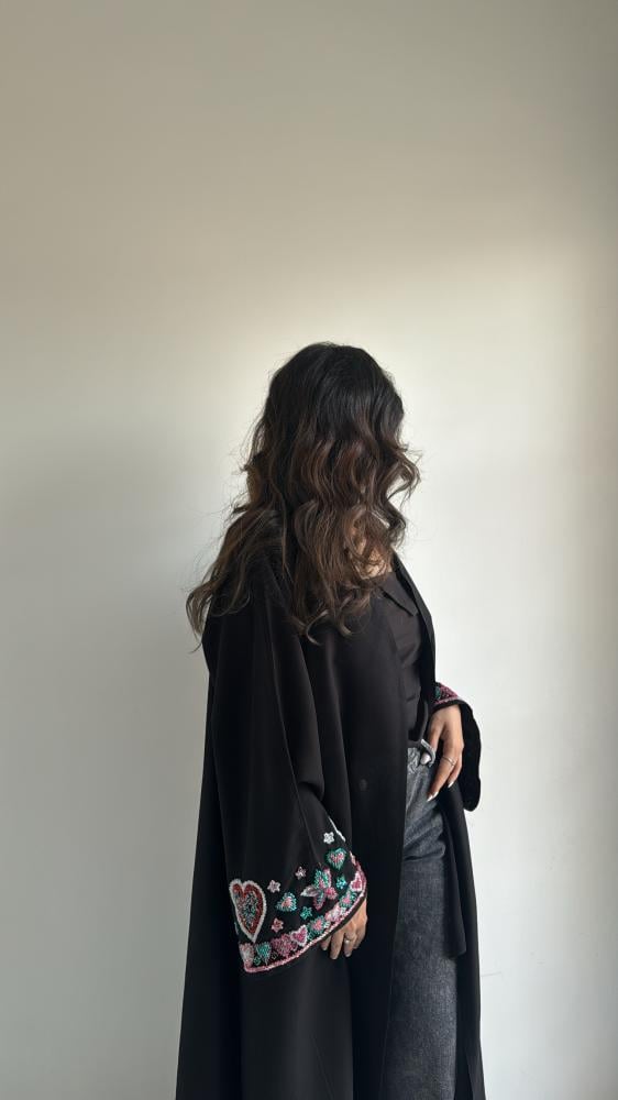 عباية كتان اسود بتطريز وشك يدوي بالاكمام