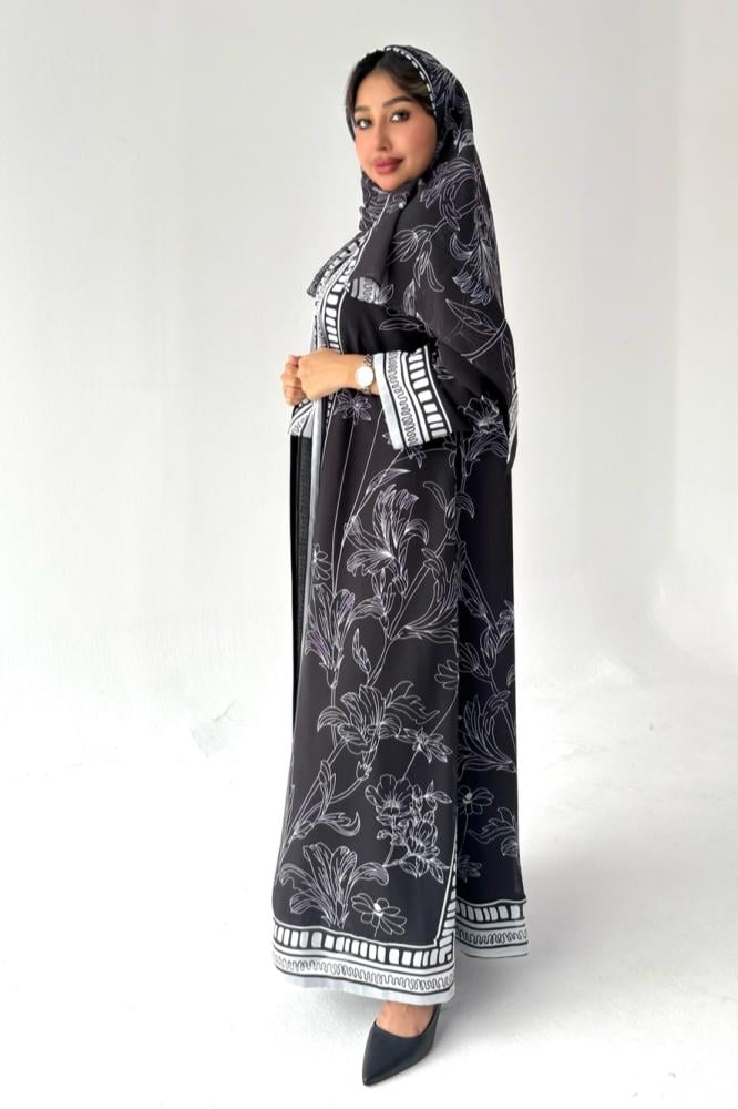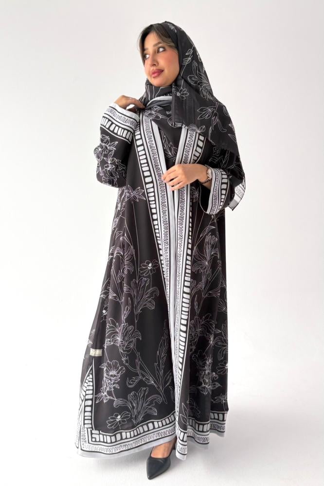 عباية أنثوية راقية بكل بساطة قماشها شيفون اسود مبطن ، طرحه شيفون طباعه 3D ! قصة العباية استريت.
