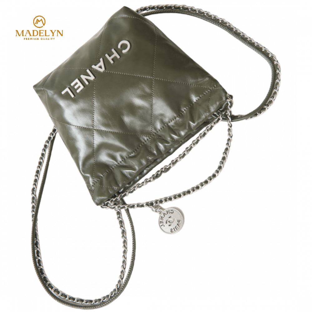 مبطنة بحياكة المعين ، مقبضان علويان بجلد وسلسلة حلقية، غلق برباط، جزء رئيسي، جيوب داخلية بسحاب
