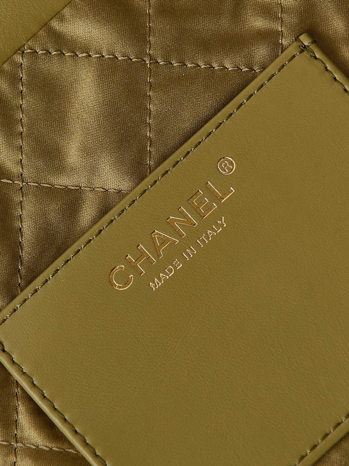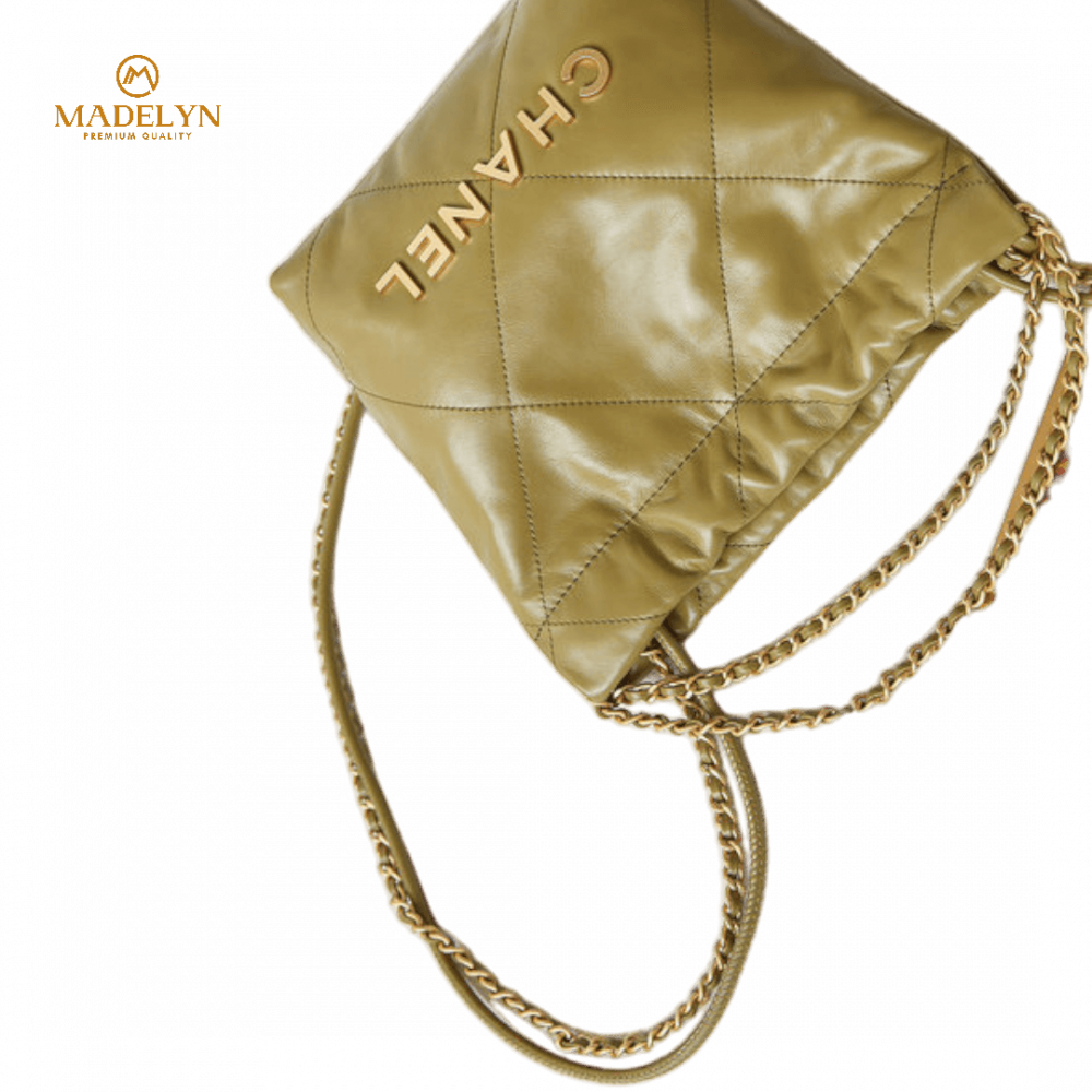 مبطنة بحياكة المعين ، مقبضان علويان بجلد وسلسلة حلقية، غلق برباط، جزء رئيسي، جيوب داخلية بسحاب