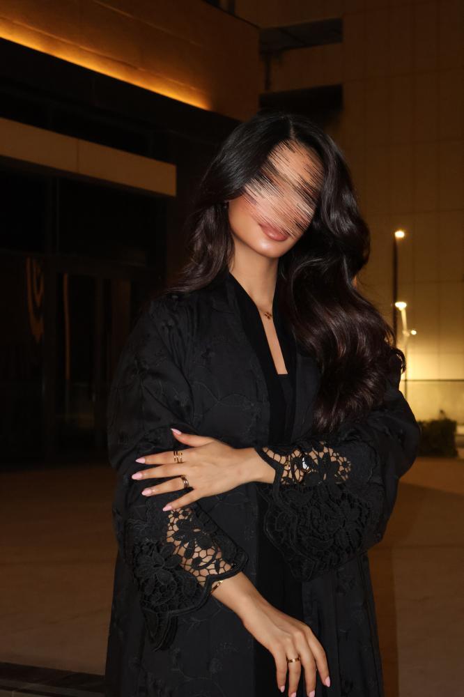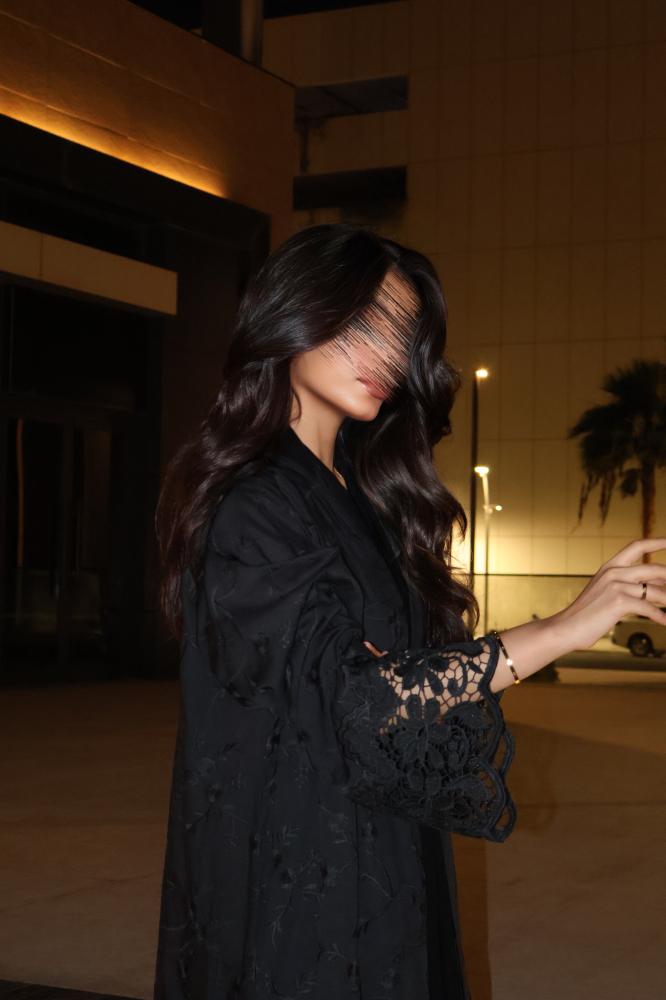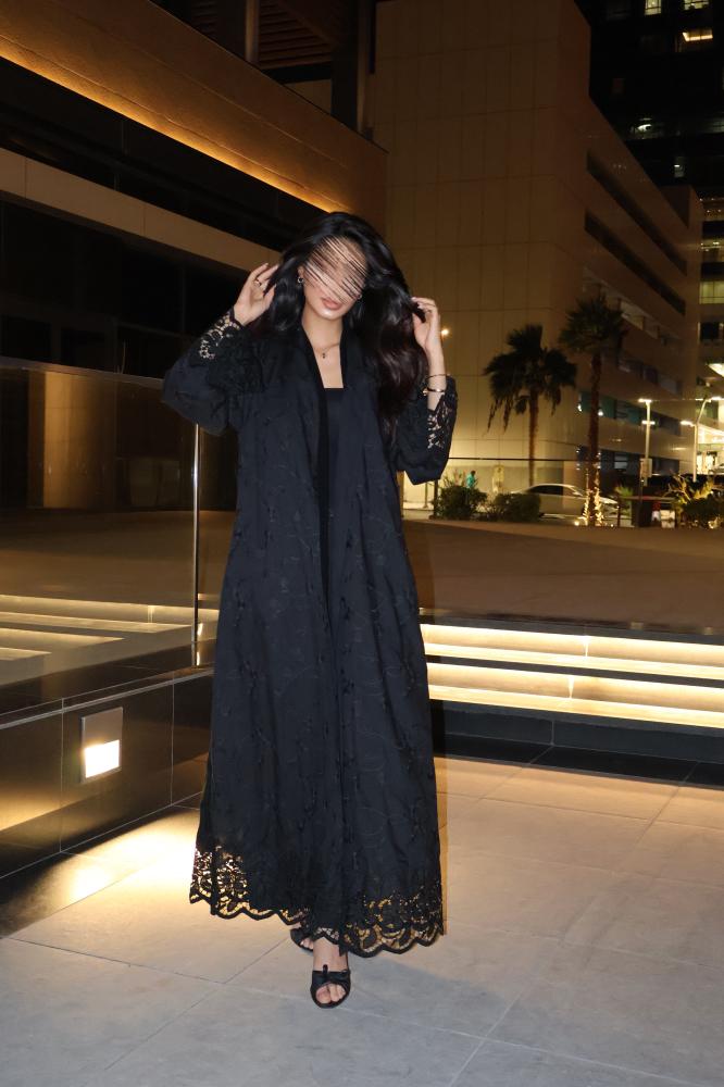 عبايه اسود بقماش روكاما واطراف دانتيل اسفل العبايه والكم وطرحه اسود اطراف روكاما