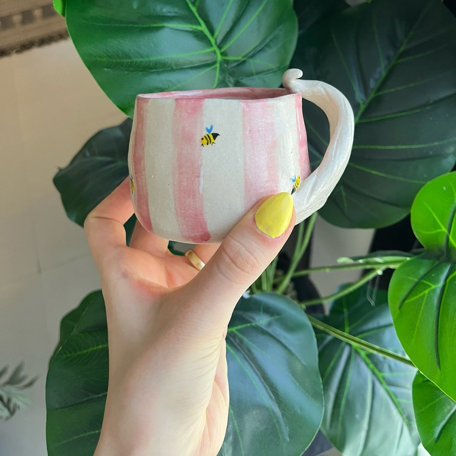 كوب مصنوع يدويًا 100% بلون وردي ناعم، يتوسطه تصميم لشخصية القطة ياسمينا وهي تميل رأسها بحركتها المميزة، وحولها نحلات صغيرة تضيف لمسة مرحة وحيوية للتصميم