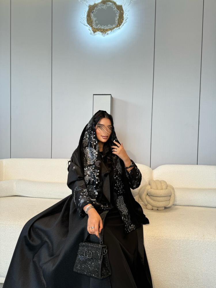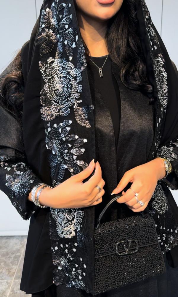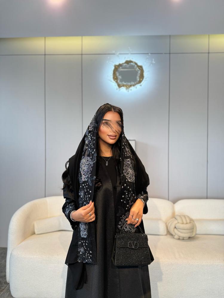 تفتة روسي اسود قصة نص كلوش من الاكمام تل شك رمادي و اسود + طرحة مميزة طرف شك مورده اسود رمادي