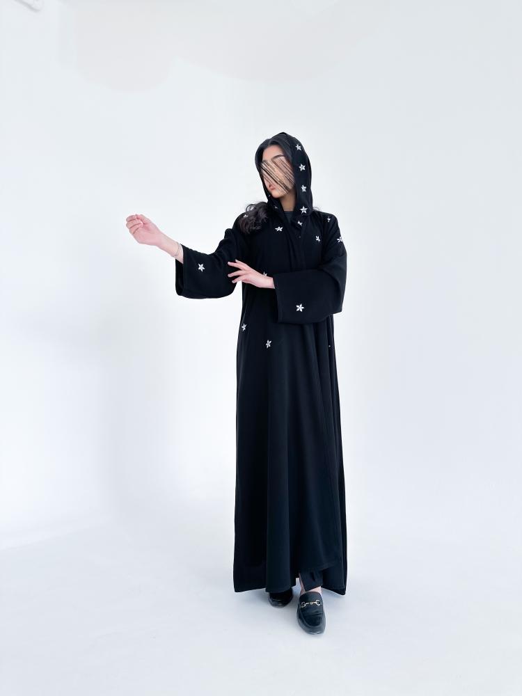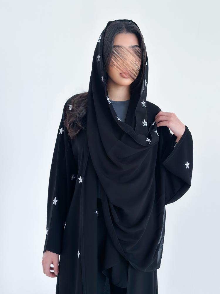 عباية بقماش كريب ملكي اسود + تطريز ابيض