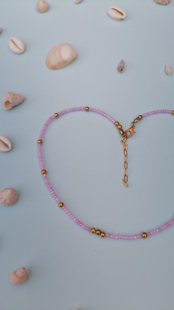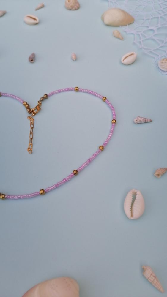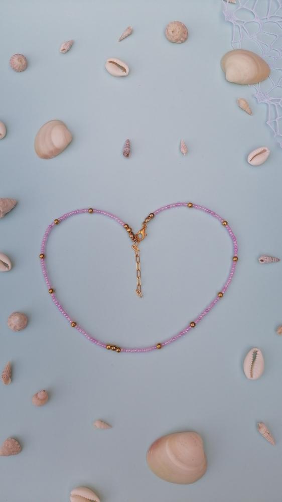 قلاده مصنوعه يدوياً بإستخدام الخرز بلون موف ولولو بلون ذهبي