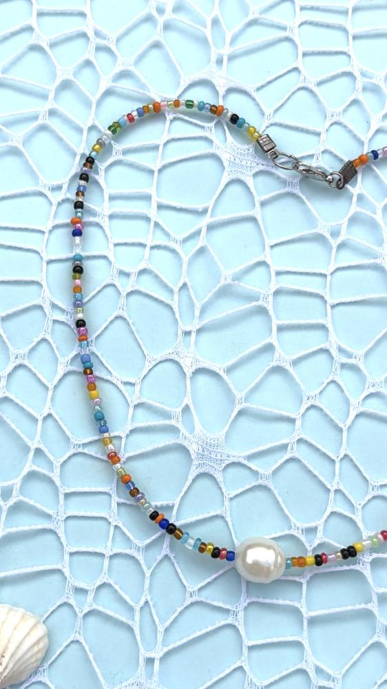قلاده مصنوعه يدوياً بإستخدام الخرز الملون وحبه لؤلؤ سكري متعرجه