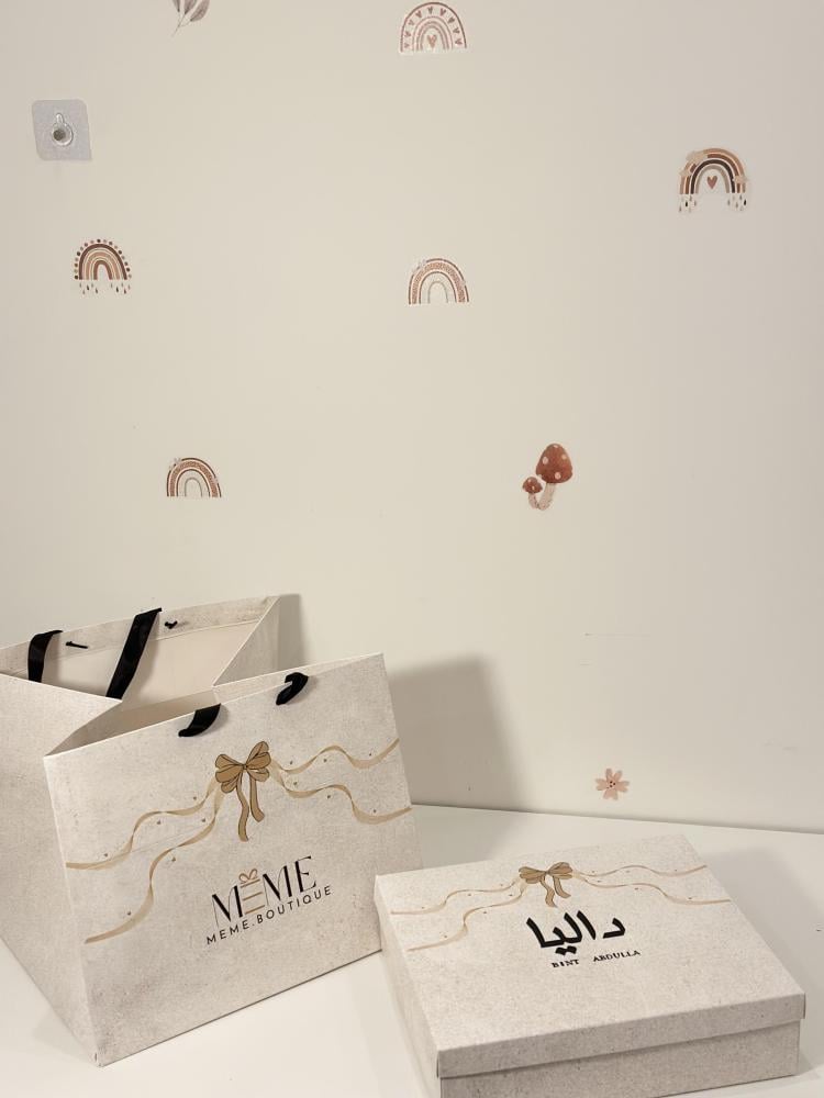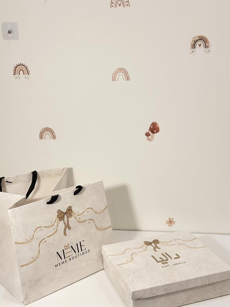 تُوضع في بوكس أنيق إضافة إلى الكيس وإضافة اسم المولوده مجاناً