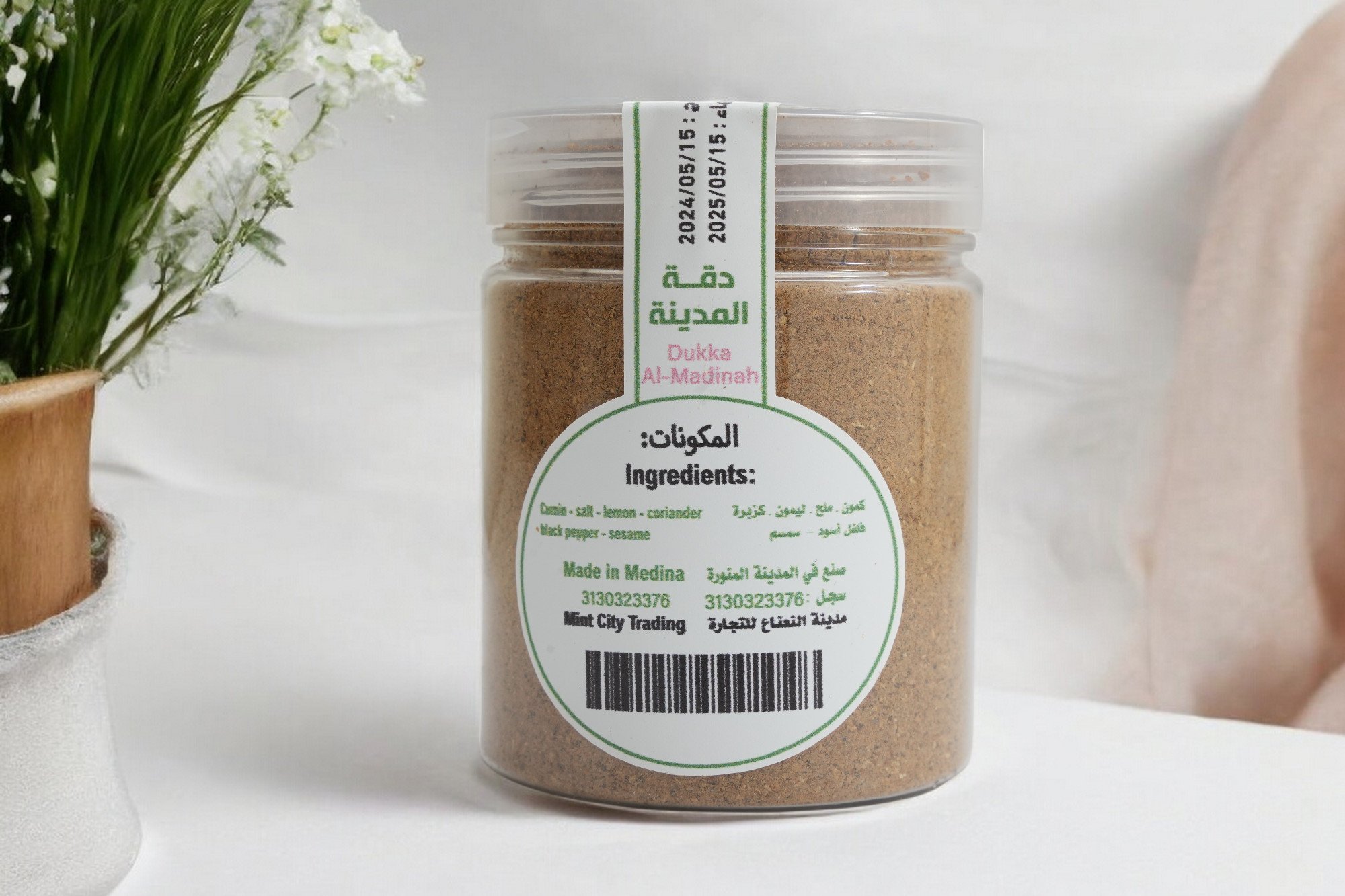 دقة مدينيه فاخرة مكونة من مزيج من البهارات والسمسم الحجازي، تُضاف عادةً مع "الفول- الزبادي- والتمر أحيانًا"