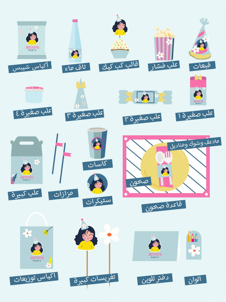 - يمكنك اضافة منتجات اخرى على هذا البكج ليصبح لديك بكج متكامل كالبنياتا ومثلثات الزينة والبالونات ومفرش الطاولة والكيك توبر