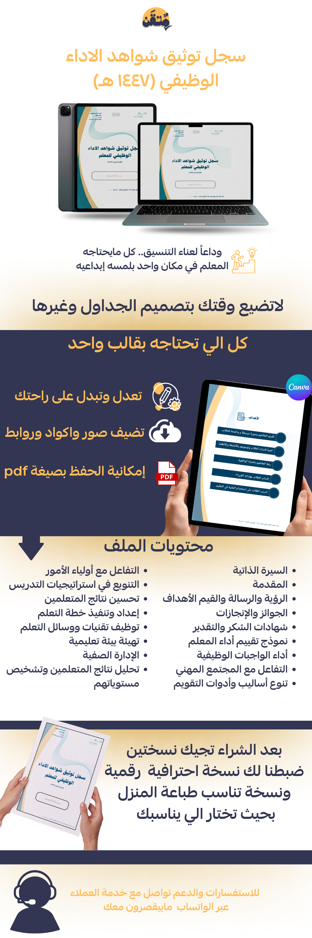 لأن إنجازك يستحق أن يُعرض بإتقان، صممنا لك في متجر مُتقن سجلاً متكاملاً يجمع بين الفخامة البصرية والمرونة المطلقة. بما يتوافق مع أحدث معايير ميثاق الأداء الوظيفي بوزارة التعليم.