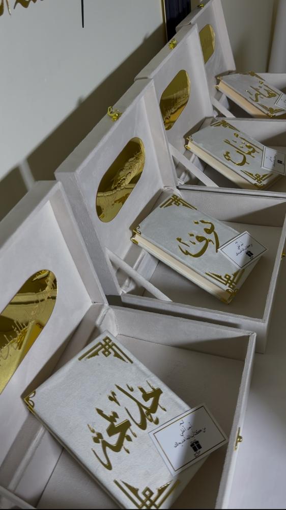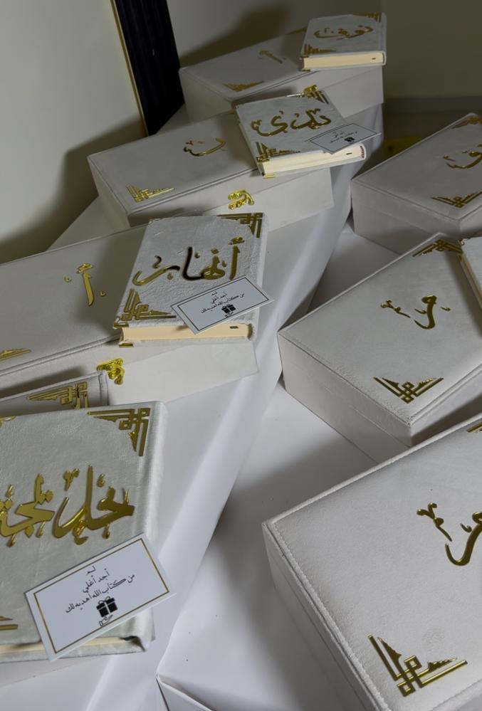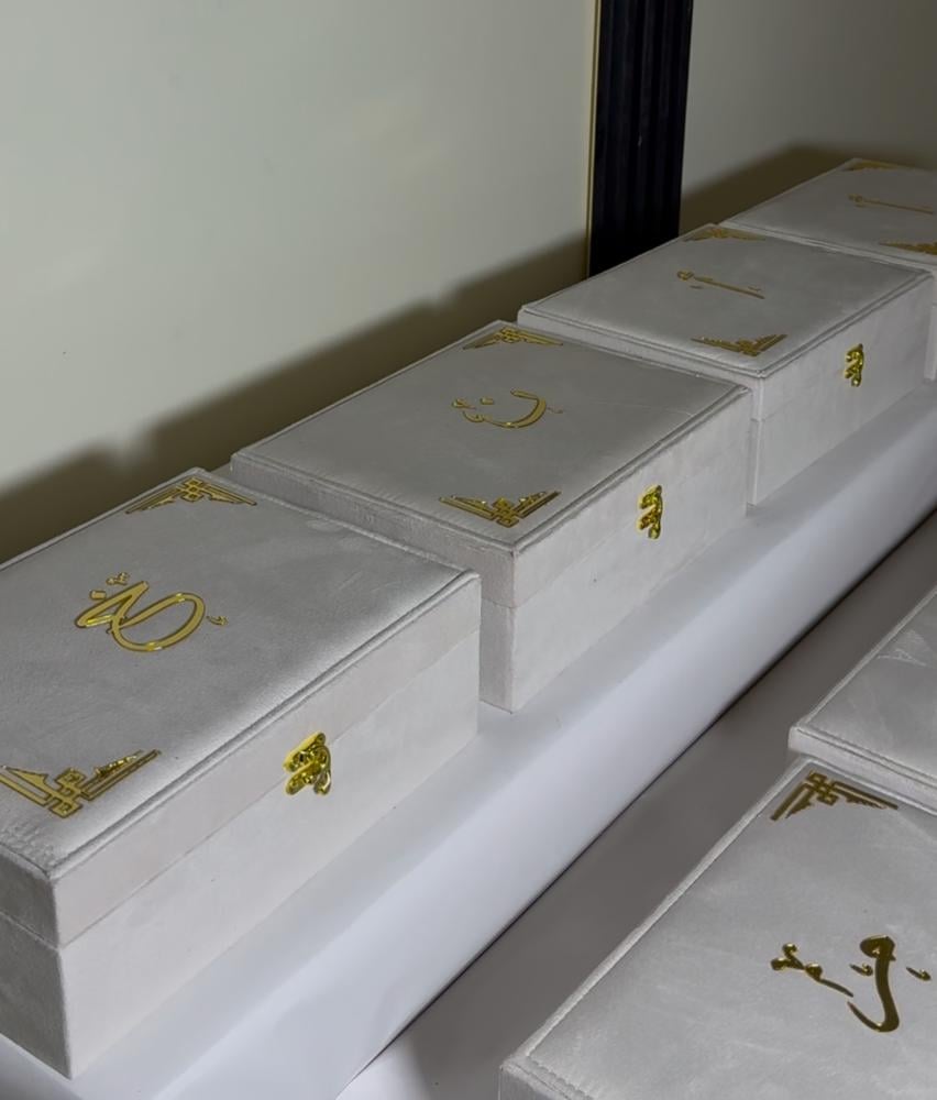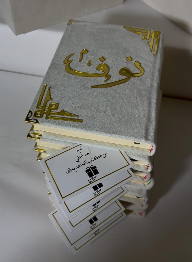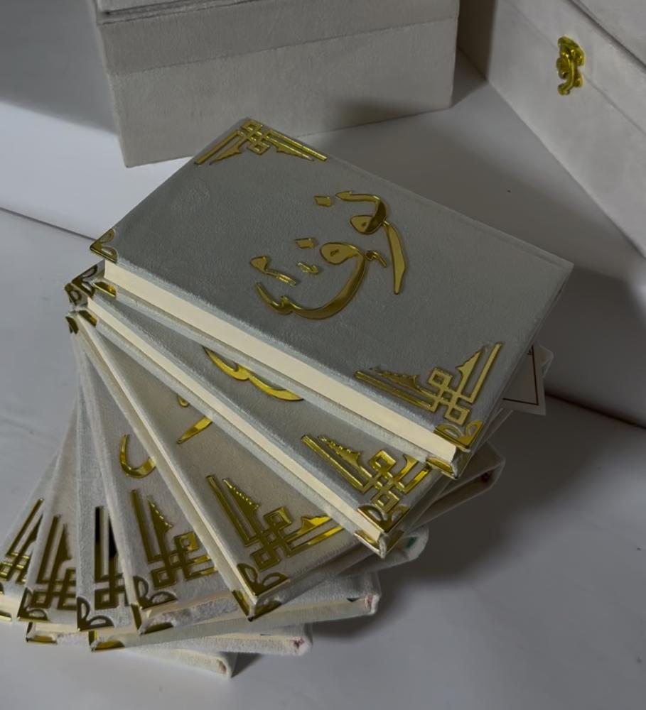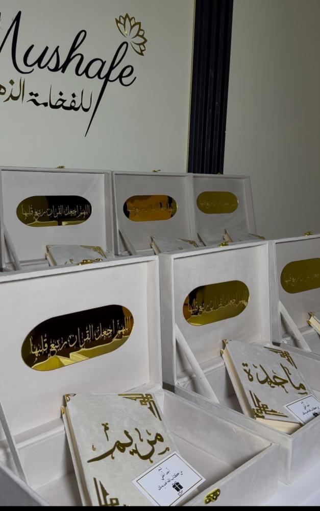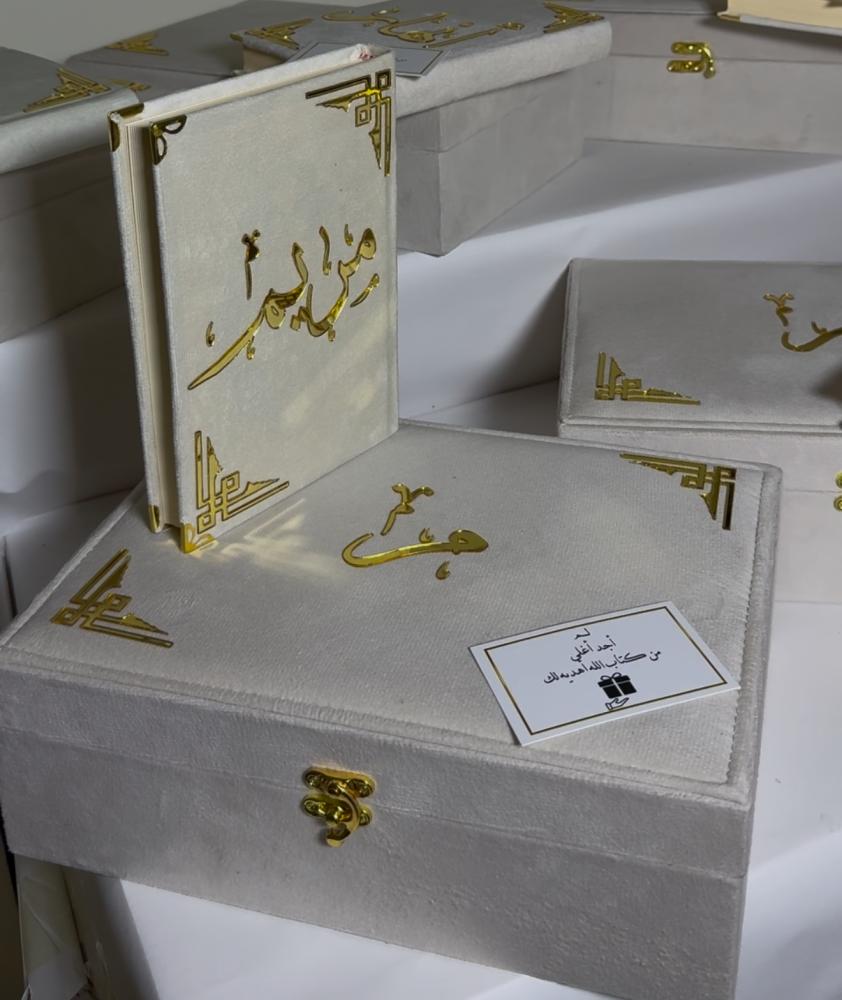 بوكس مخملي شامل التنسيق +مصحف حجم المعتاد شامل الاسم والتنسيق + كرت اهداء