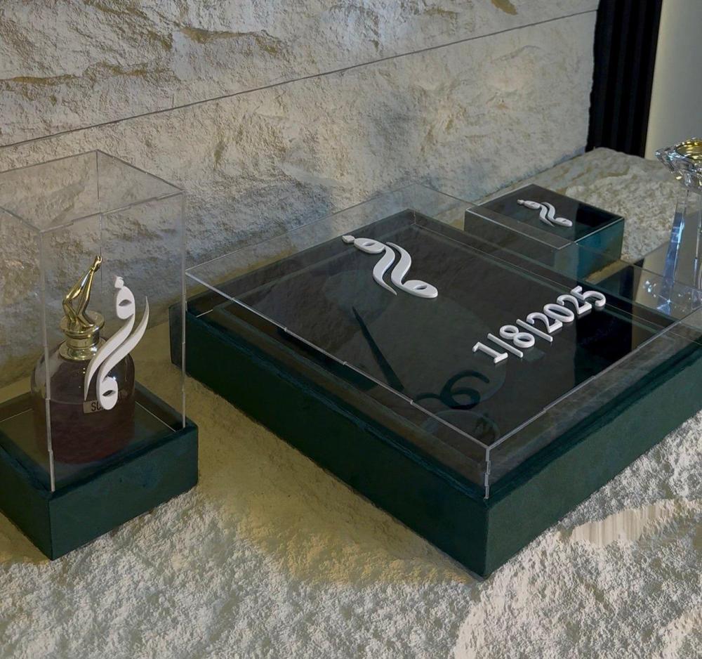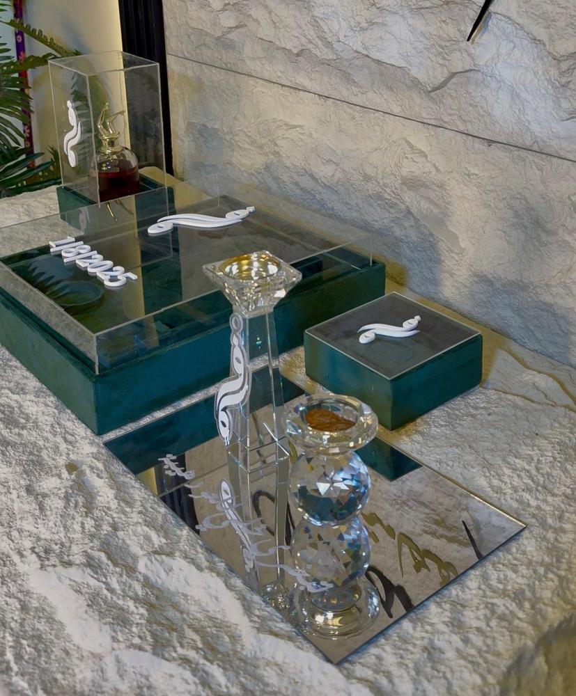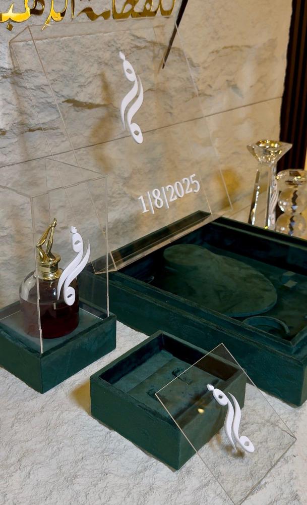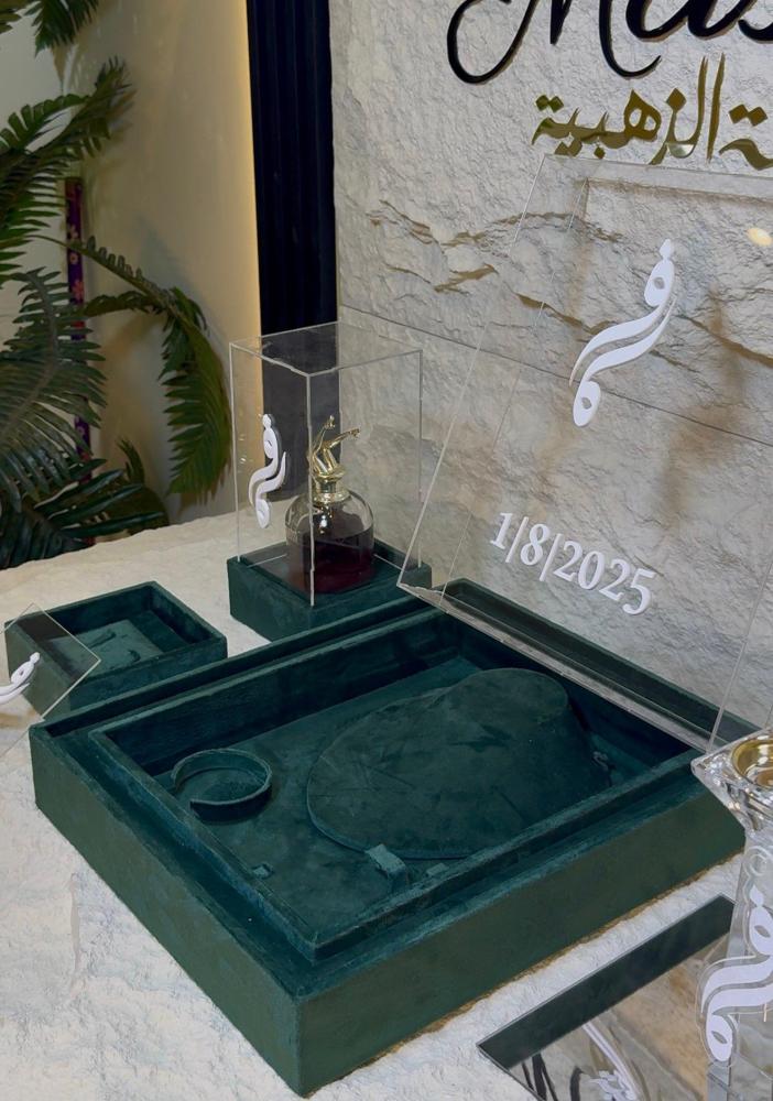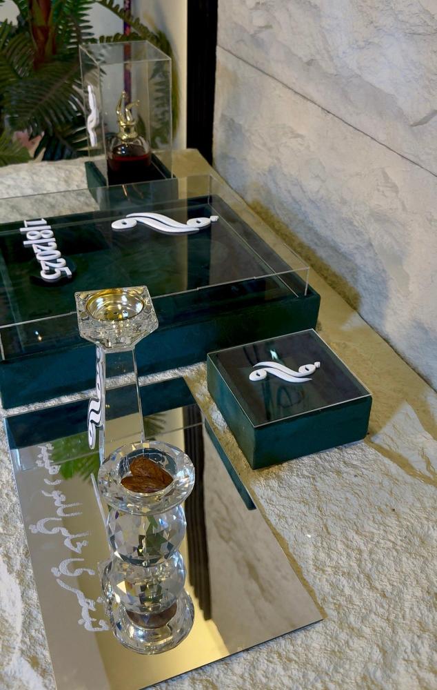 بكج عروس بوكس العقد المخملي بغطاء اكريليك +بوكس العطر +بوكس الدبل +مجموعة المبخرة الكريستال شامل التنسيق والاسم تفصيل ألون حسب الطلب