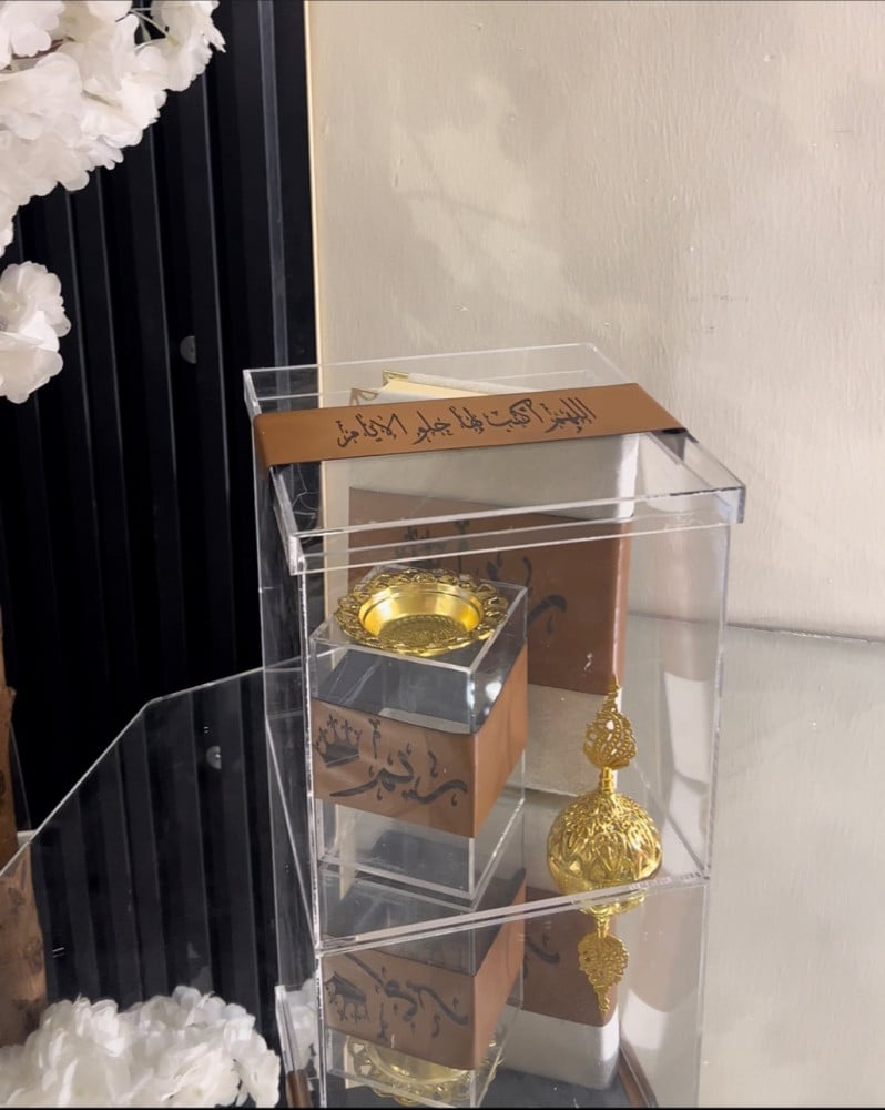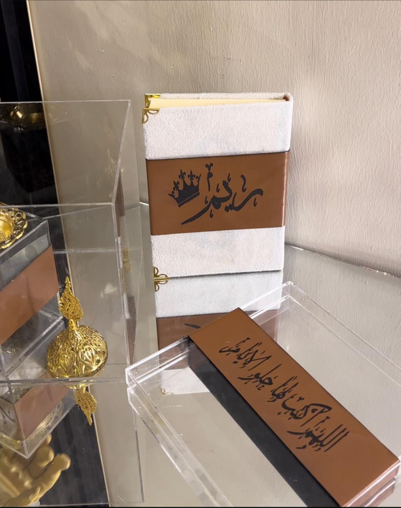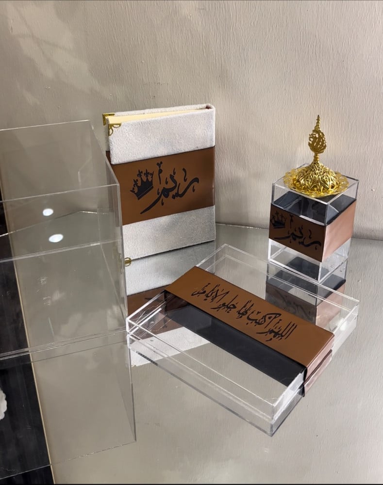مجموعه فاخره بوكسً اكريلك بتصميم الجلد +مصحف معتاد بتصميم الجلد+ مبخره اكريلك بتصميم الجلد