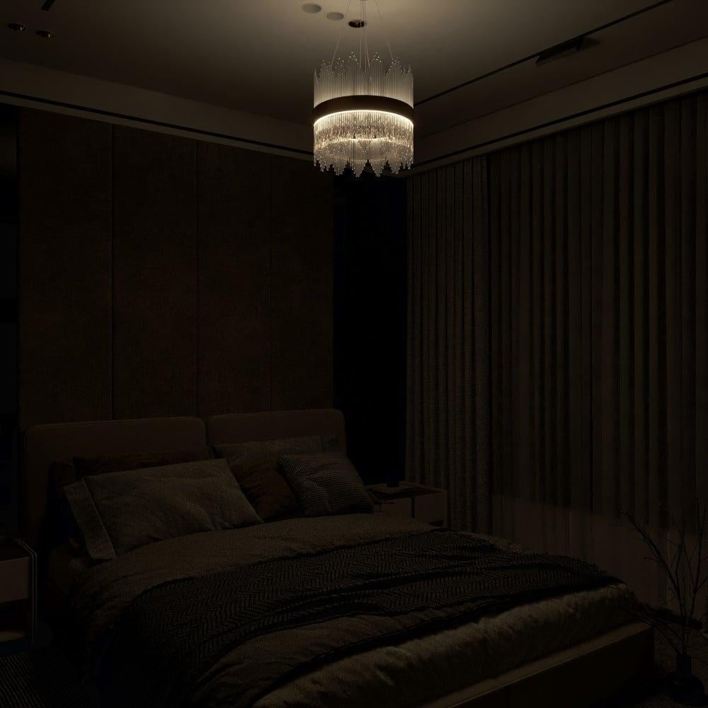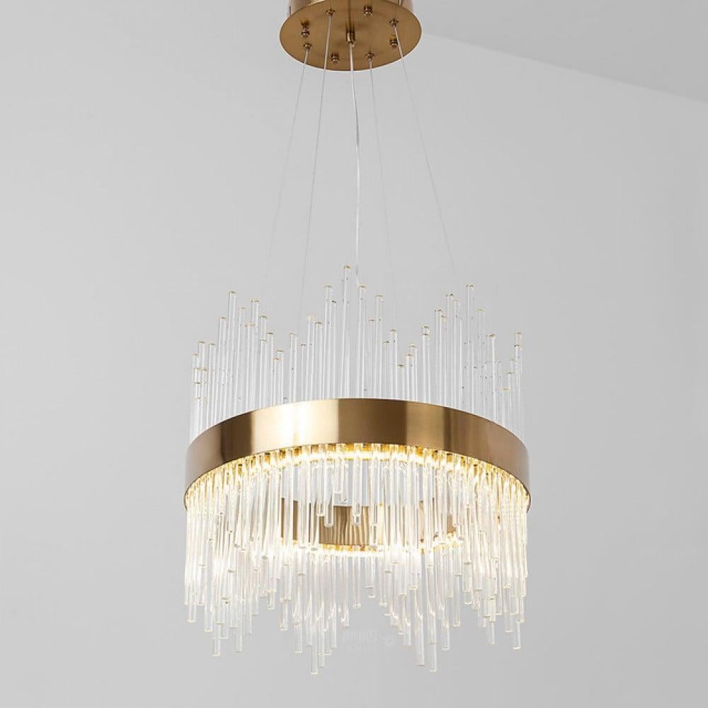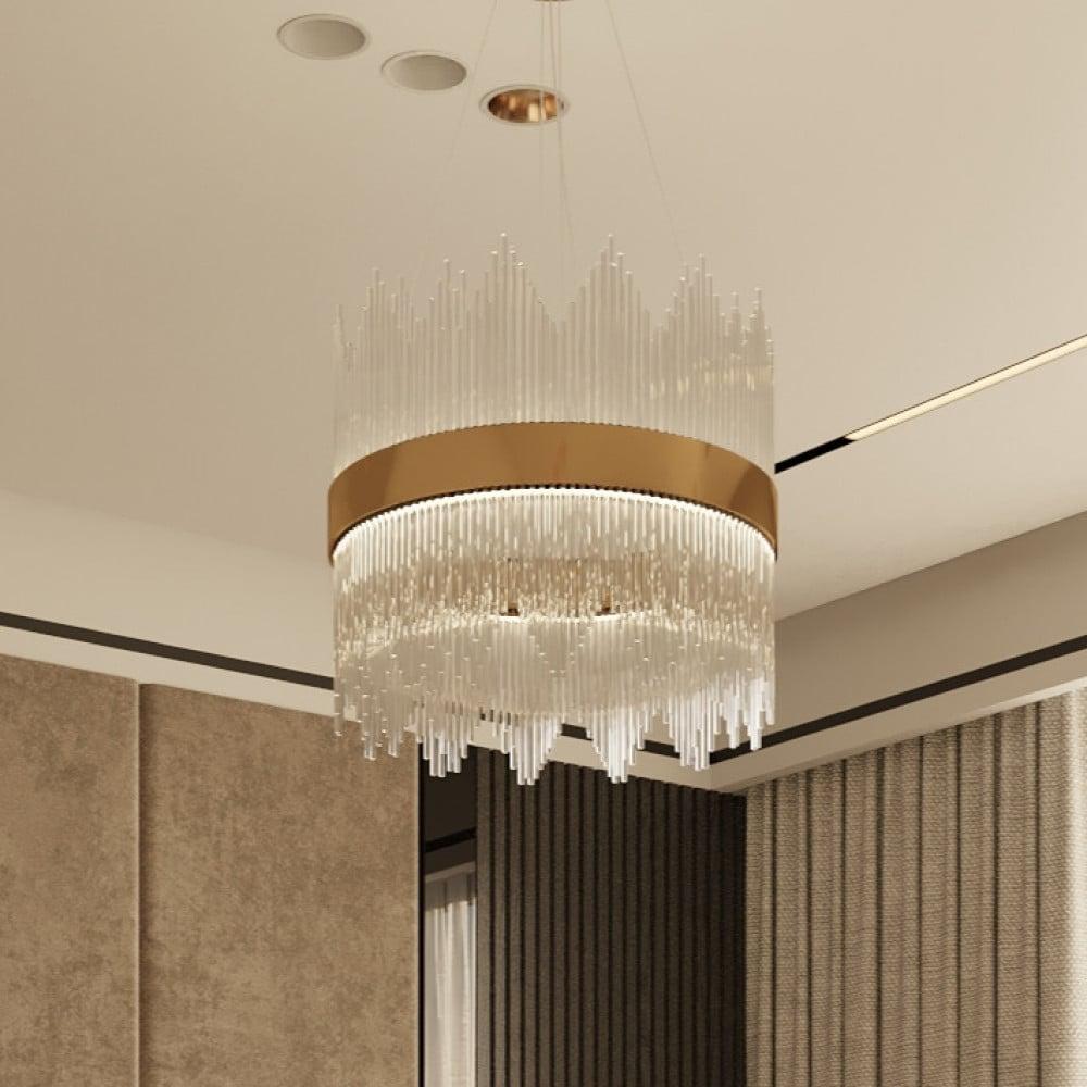 ثريا كريستال بحزام ذهبي يحيط بمجموعة من الكريستال الأنبوبي متفاوتة الطول لتصنع مساحة ديكورية تجذب الأنظار و تمنح الغرفة مظهرًا مميزًا