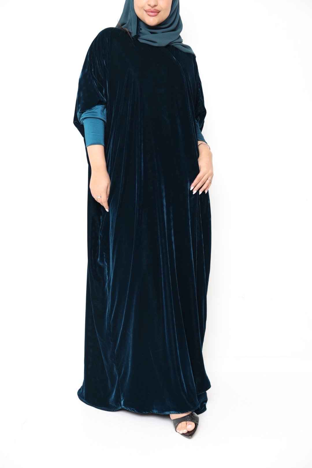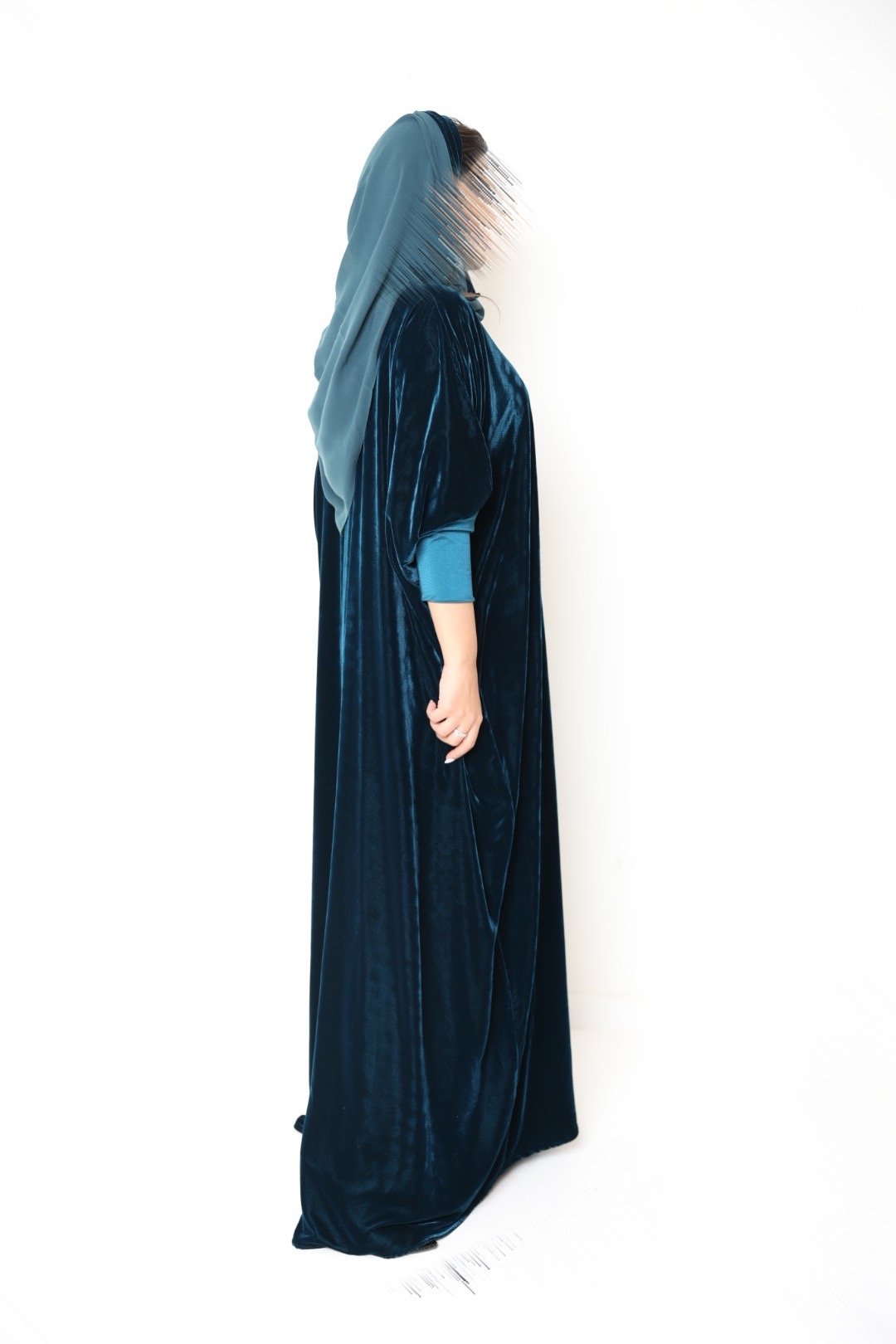 عباية من مخمل ناعم بلون بترولي عميق يعكس أناقة هادئة ولمسة دفء.