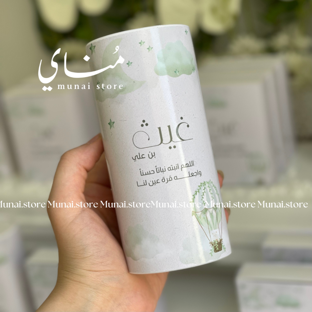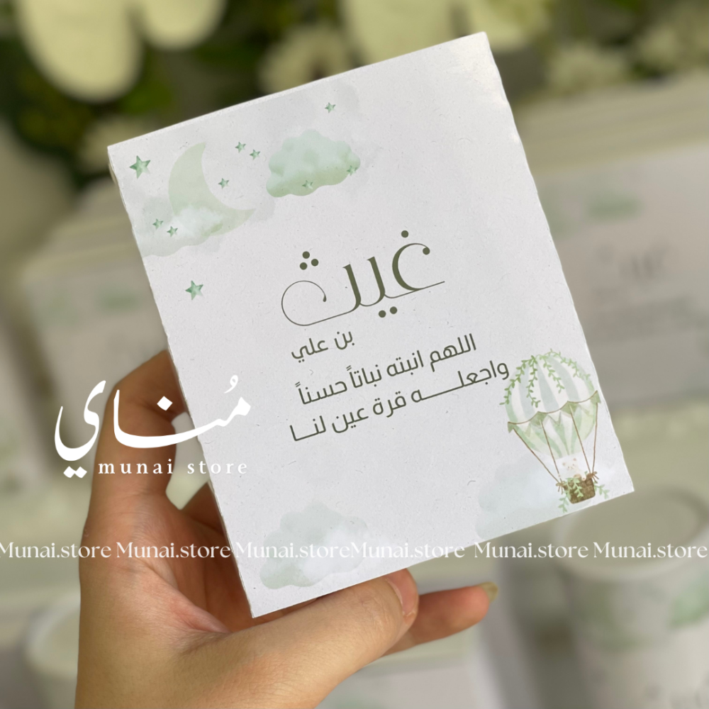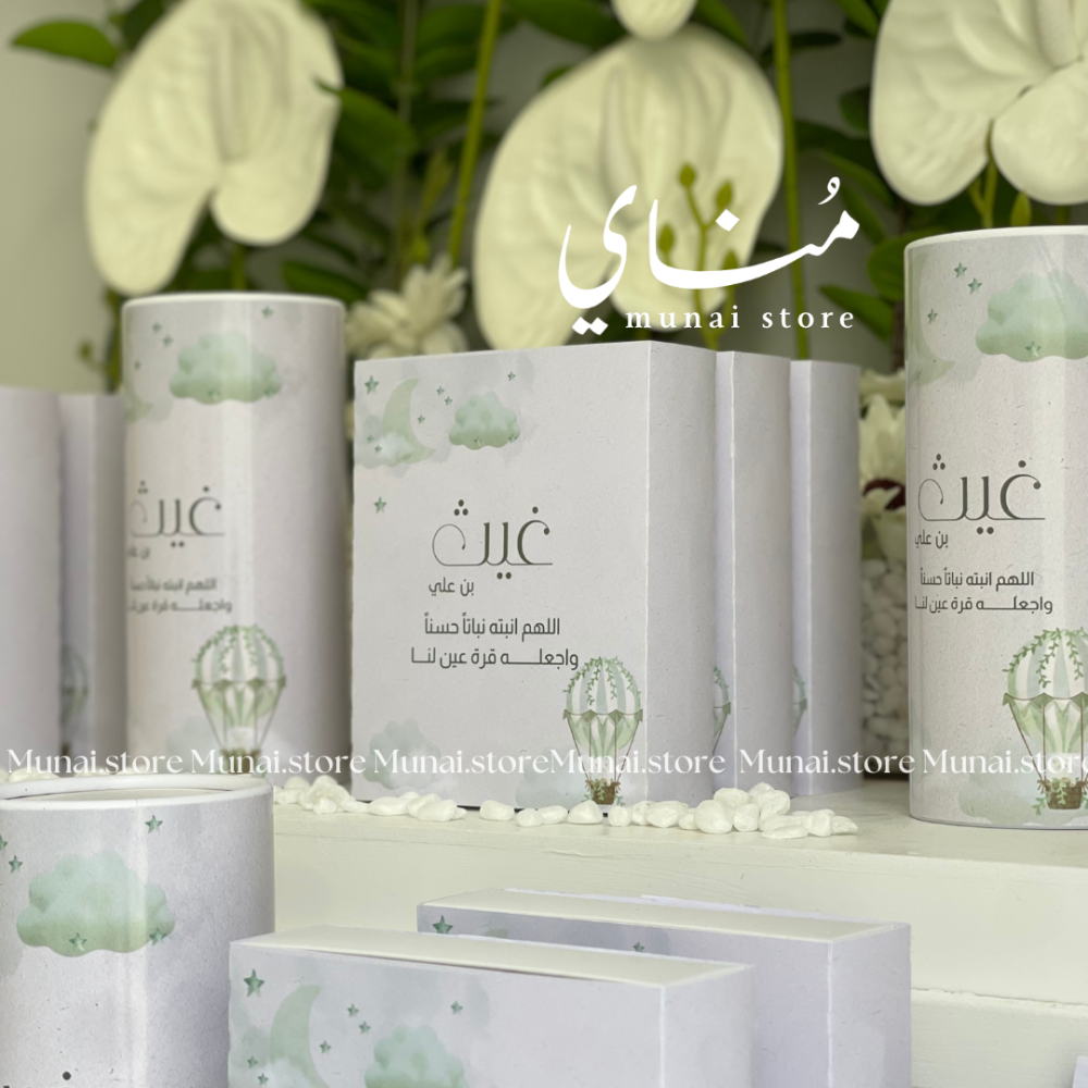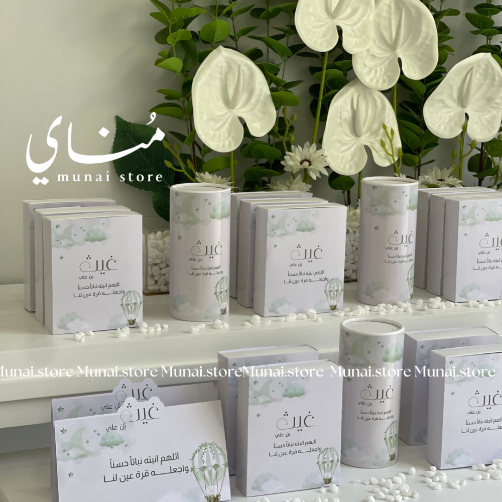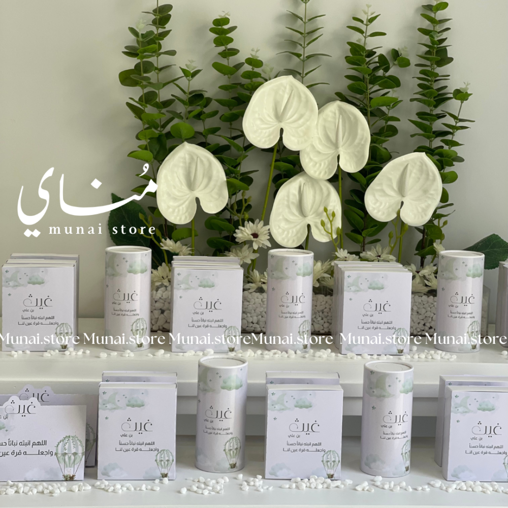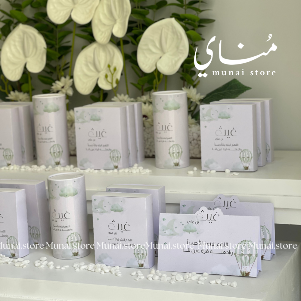 بكج بيبي غيث عبارة عن :١٢ تعليقة الحجر العطري ( شكل حصان ) .١٢ علب مناديل اسطوانية .١٢ كرت طاولة ٢ تاق باب