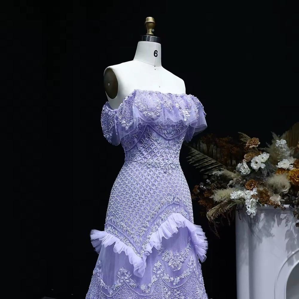 فستان سهره انيق مشغول بالكامل مع اكتاف منسدله مصمم بتصميم مميز من الخرز والشيفون