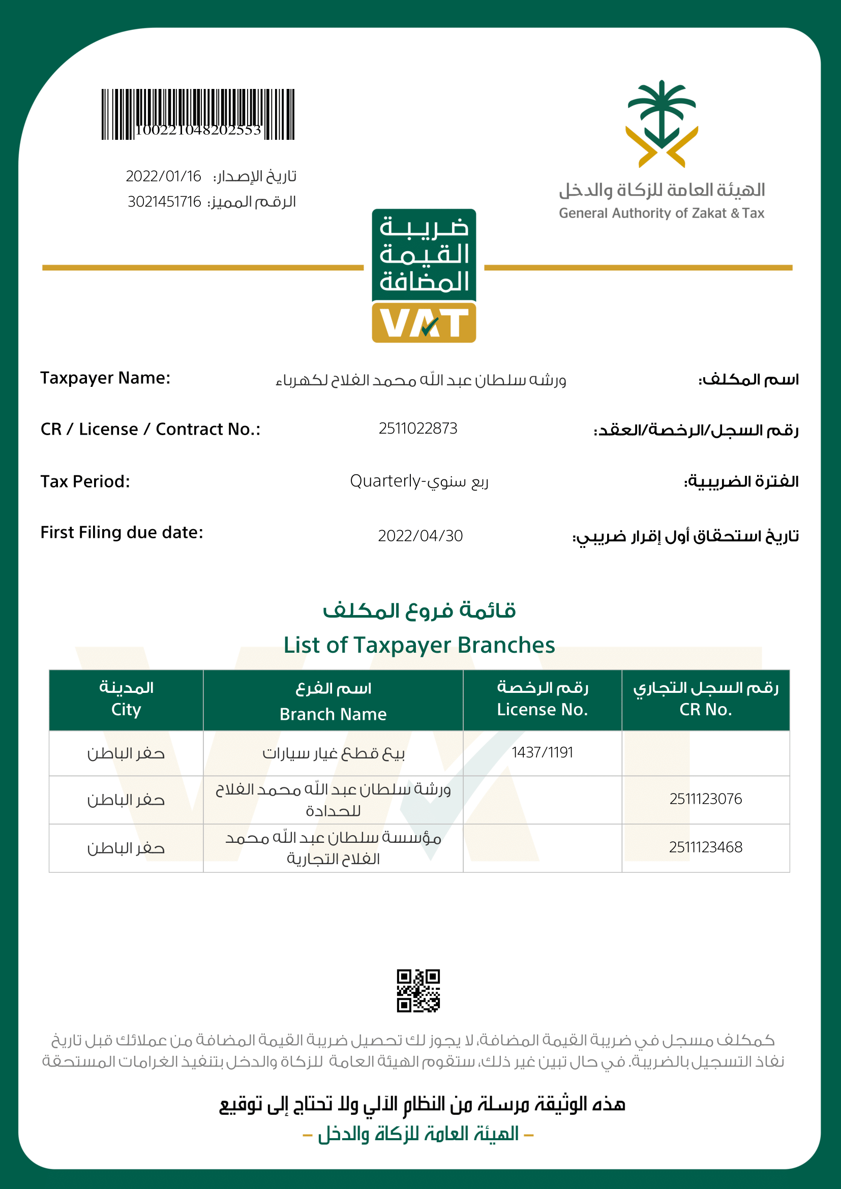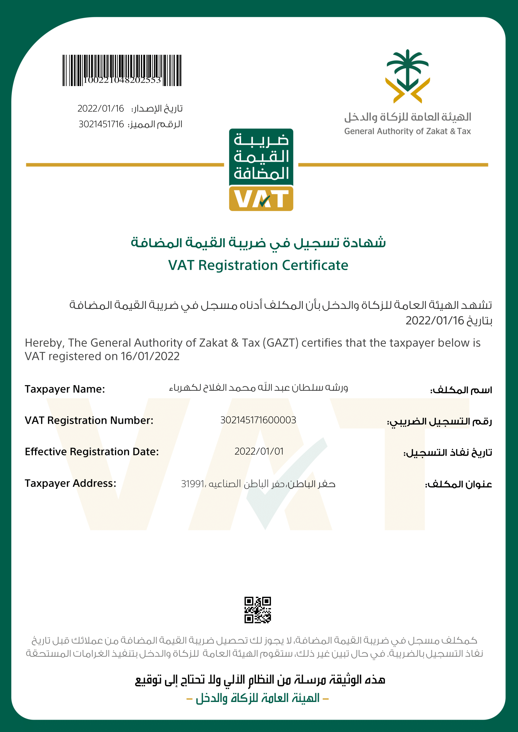 شهادة تسجيل الضريبة