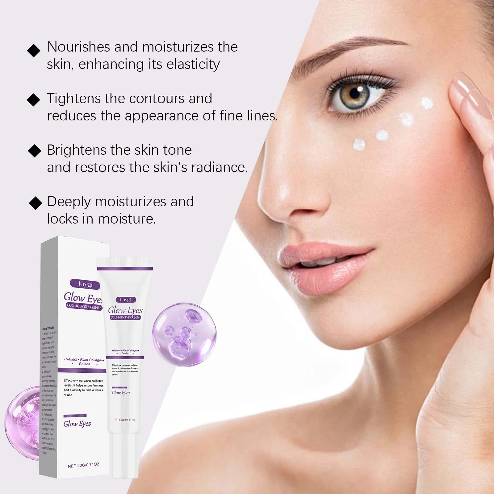 1. تم تركيب كريم العين الكولاجين الخاص بنا لتعزيز مرونة الجلد، وتنعيم الخطوط الدقيقة بشكل فعال وأقدام الغراب حول العينين.