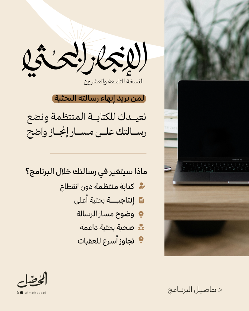 برنامج الإنجاز البحثي، يطلق نسخته الـ 29، وهو أول برنامج عملي موجه لطلاب الدراسات العليا، يضعك داخل بيئة بحثية داعمة ومنضبطة ترافقك خلال فترة العمل على رسالتك، وتساعدك على التقدم الفعلي بدل الدوران في مكانك.
