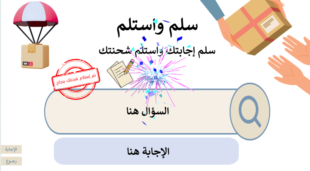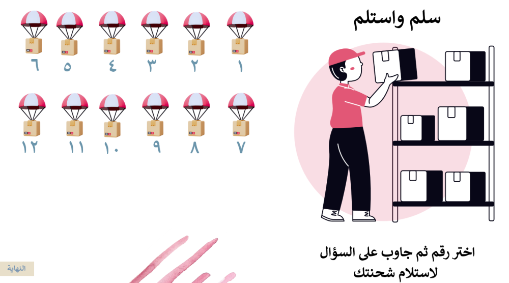 يختار المتعلم أحد الصناديق (من ١ إلى ١٢) لاستلام شحنته، فتظهر له بطاقة تحتوي على سؤال.