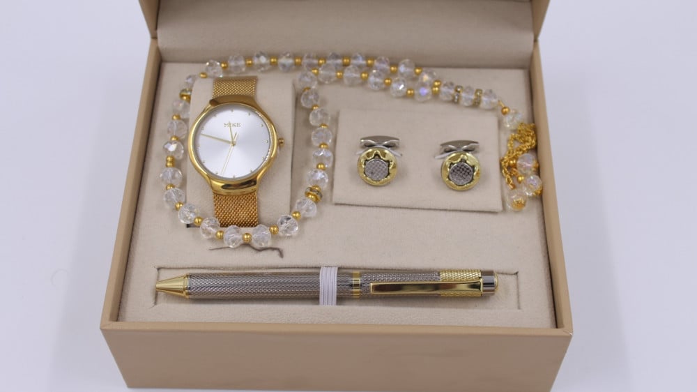 - تقدم ماركة "مايكي" طقمًا فريدًا يتألف من قلم وساعة وكبك ومسبحة. يعتبر هذا الطقم هدية رائعة للرجال والنساء على حد سواء، بما في ذلك العروسين في يوم زفافهما أو في المناسبات الخاصة الأخرى.