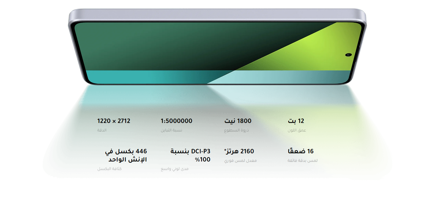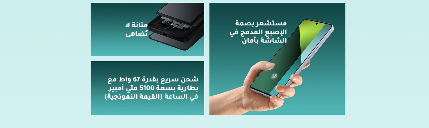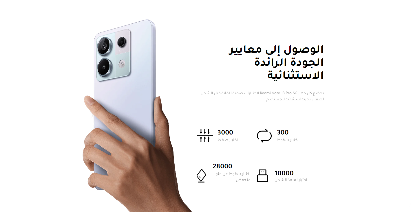 - محتوى العلبة : Redmi Note 13 Pro 5G - محول - كابل USB من النوع C - أداة إخراج بطاقة SIM - حافظة واقية - دليل البدء السريع - بطاقة ضمان