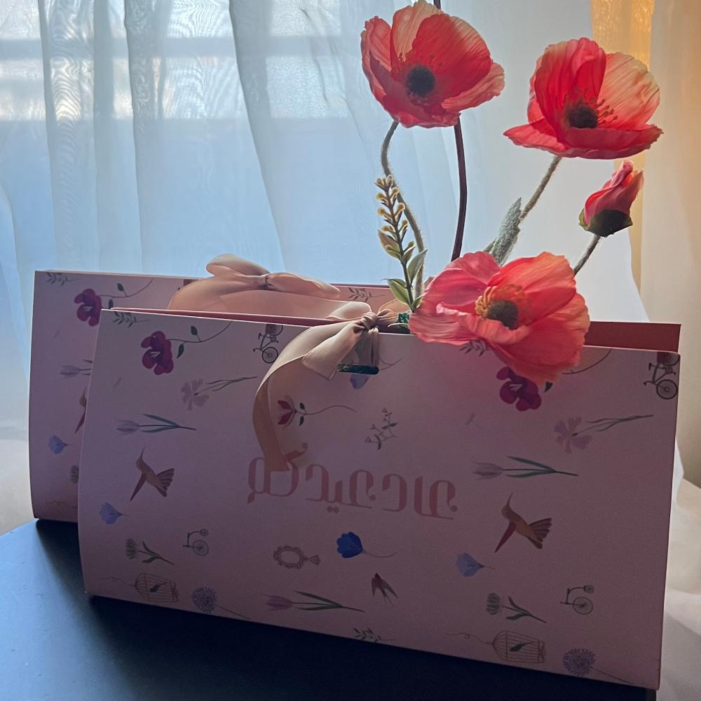 حقيبه لتوزيعات العيد مزينة بالورد الصناعي تحتوي على مرايا ميني ، شمعه ، مبرد