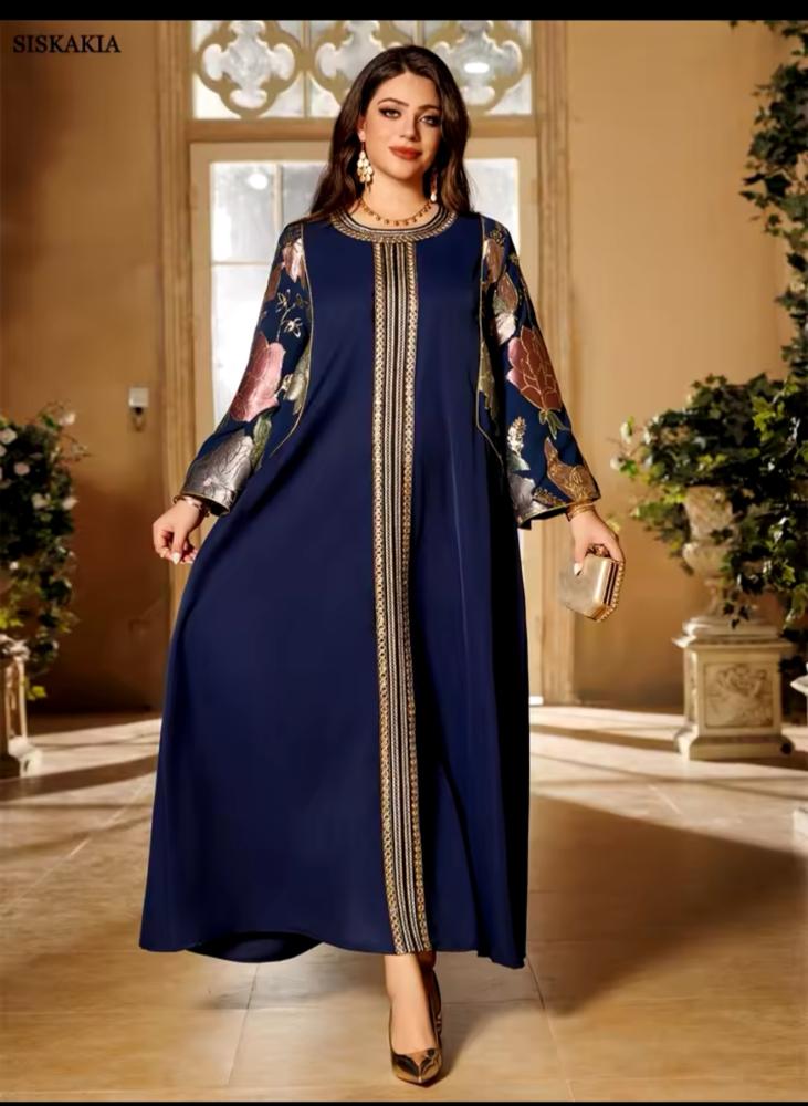 فساتين سيسكاكيا رمضان للنساء المسلمات بأكمام بتلات ذهبية ورقبة دائرية مخططة في دبي للنساء