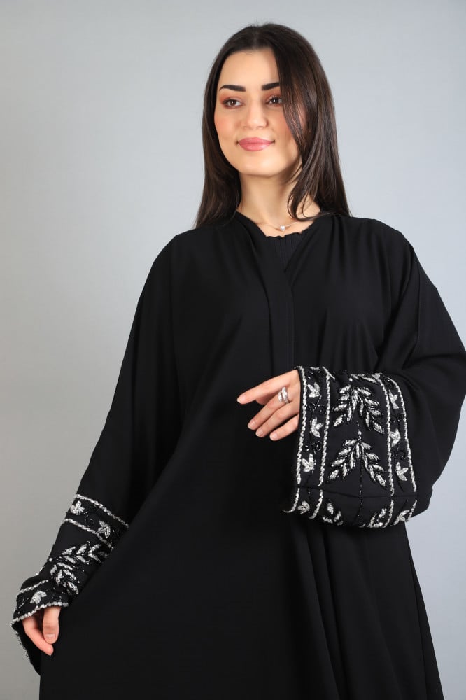 عبايه من قماش الكريب الامريكي باللون الاسود يوجد شك على الاكمام تتميز بالتصميم العصري والمثالي والمناسب لجميع الاوقات يوجد طرحه مع العبايه