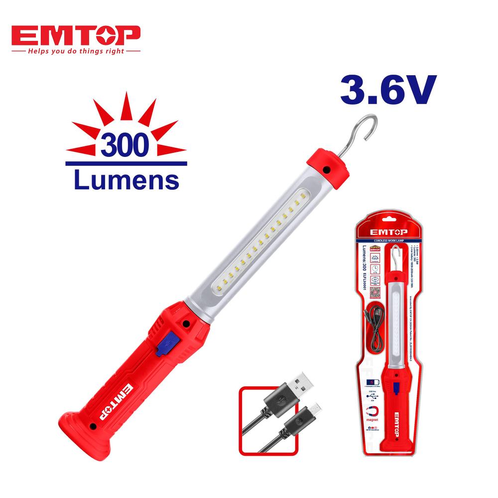 مصباح عمل EMTOP، كشاف لاسلكي LED، مصباح 300 لومن، كشاف ورش وصيانة، مصباح محمول مغناطيسي، مصباح مع خطاف تعليق، LED work light EMTOP، مصباح صيانة سيارات، إضاءة ورشة عمل، كشاف يدوي احترافي.