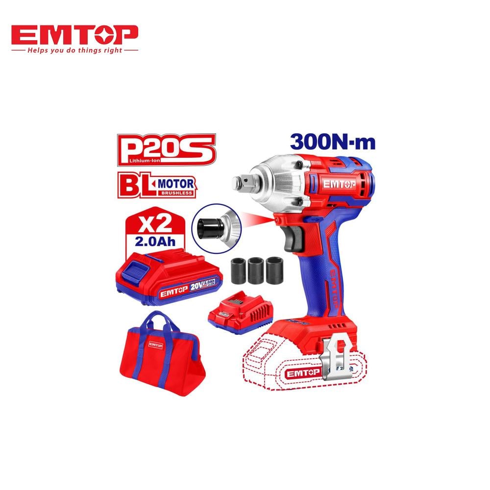 مفتاح ربط لاسلكي 20 فولت، EMTOP impact wrench، مفتاح عزم دوران 300Nm، مفتاح ربط احترافي، مفتاح كهربائي لفك العجلات، cordless impact wrench 20V، مفتاح ربط بدون فحمات، أدوات كهربائية صناعية، مفتاح EMTOP، بطارية مزدوجة.