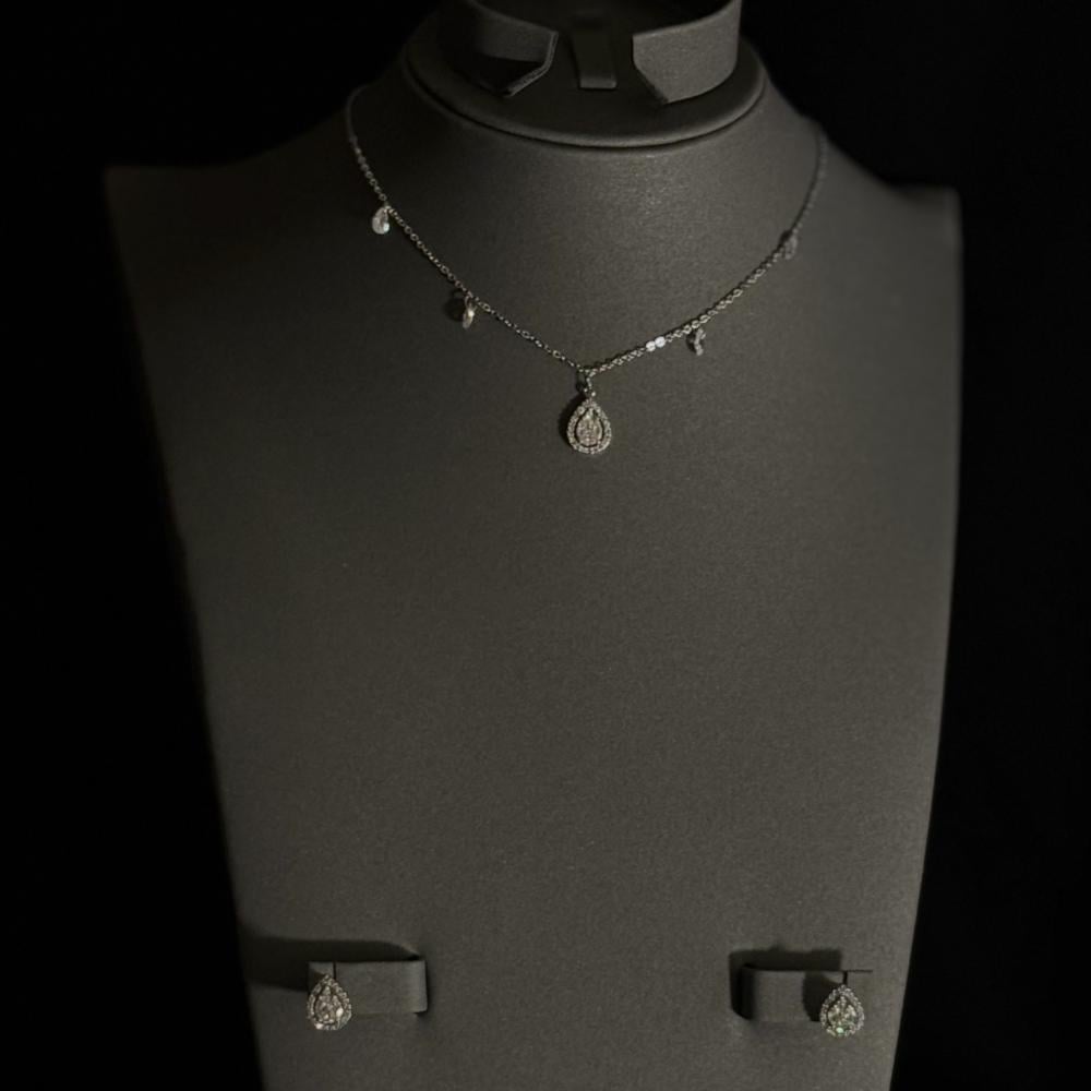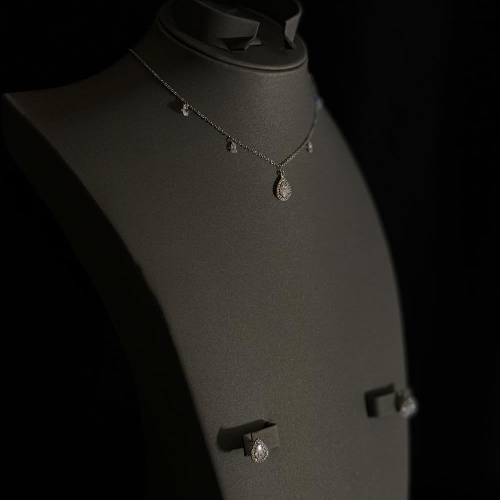 شوكر أنيق، حيث يحتوي العقد على سلسلة رفيعة مرصعة بأحجار صغيرة، ويتدلّى منه حجر كبير بشكل قطرة ماء محاط بأحجار لامعة أصغر.