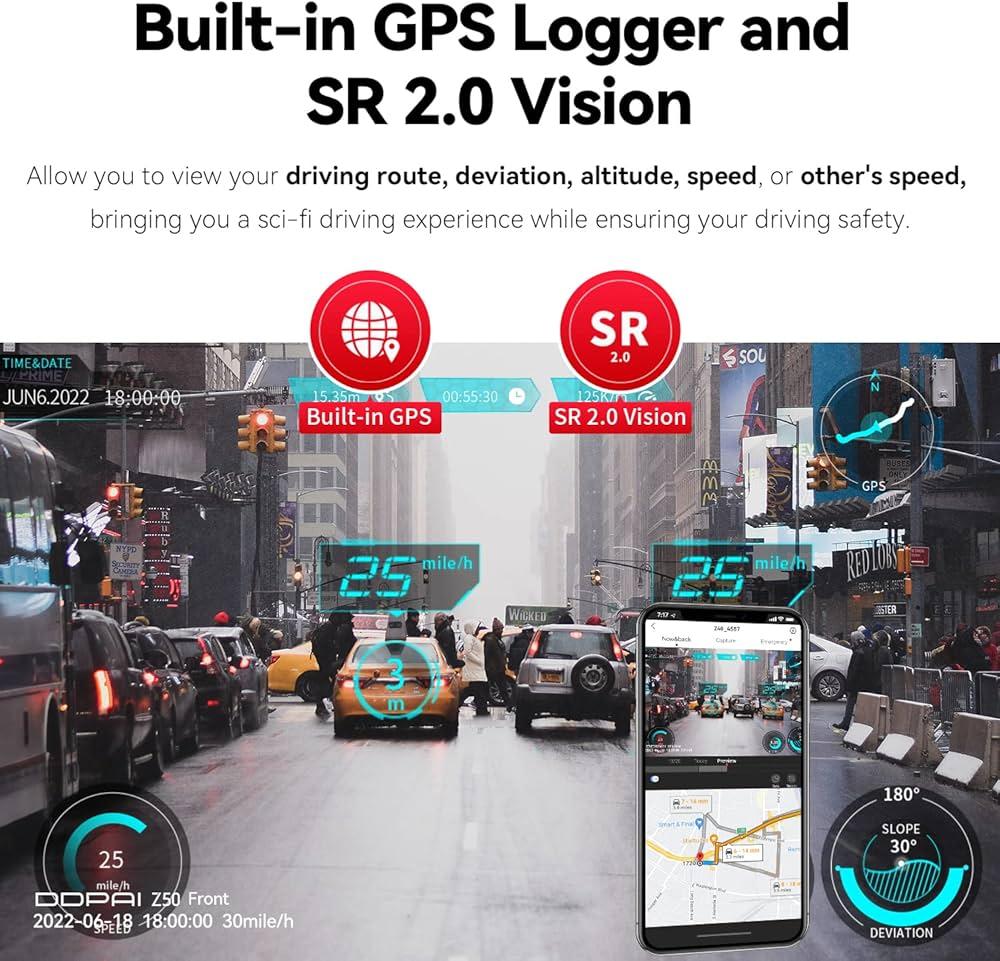 تقدم الكاميرا ميزة الواقع الافتراضي من خلال مستشعر جيروسكوب عالي الدقة لتقديم تسجيل فيديو يظهر سرعة سيارتك والسيارات من حولك أيضاً بالاضافة الى المسافة الفاصلة بينك وبين السيارت أيضاً مما يجعل تسجيلك أكثر تميزاً.