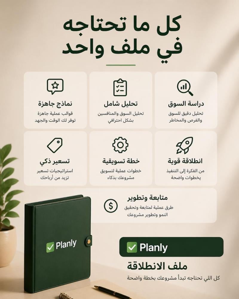 كلمات مفتاحية (SEO): دراسة جدوى جاهزة، بناء مشروع تجاري بسهولة، خطة تسويق، هوية براند، تحليل السوق، تسعير المنتجات، مشاريع سعودية