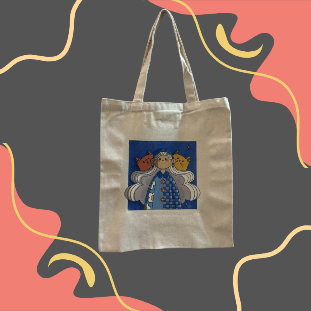 توت باق مصنوع من قماش بولستر بلون طبيعي ناعم، تتوسطه رسمة لطيفة لفتاة بملامح مرحة يحيط بها قطّان بلون برتقالي وأصفر، في لوحة فنية مليئة بالدفء والبهجة.