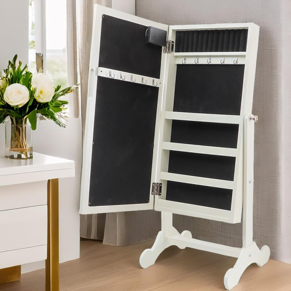 خزانة مخصصة لحفظ وتنظيم الإكسسوارات والمجوهرات ومستحضرات التجميل المتنوعة , باب مرآة محكم الإغلاق للحفاظ على الأغراض من الضياع والتلف , توفر مساحة وترتيب وسهولة الوصول للأغراض , كما أنها تضفي ديكور جميل ومميز للمكان , تعتبر من الأساسيات المهمة لحفظ الإكسسوارات والمجوهرات في أي منزل .