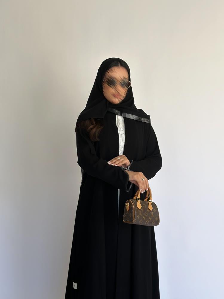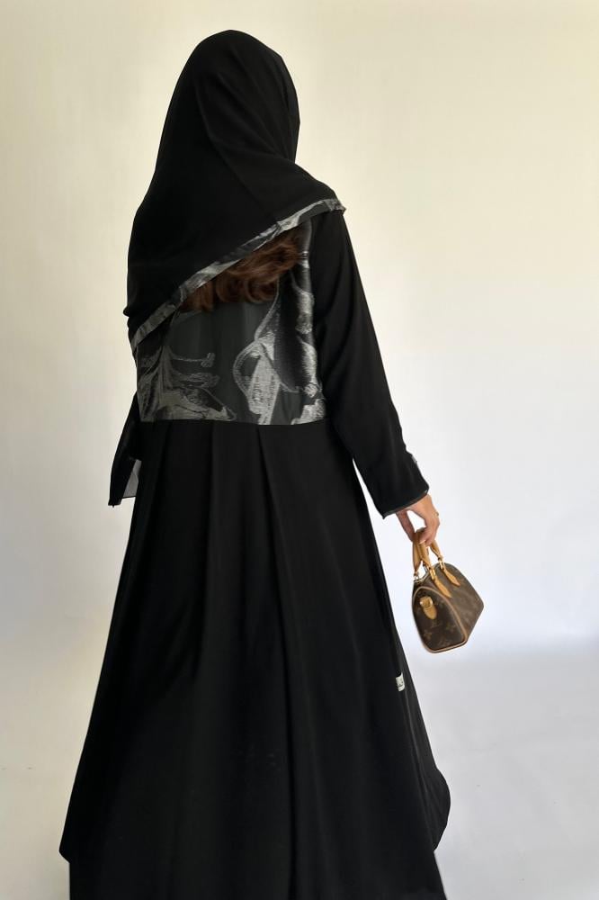 تفاصيل المنتج: القصة كلوش مع كسرات في الظهر / القماش كريب ملكي اسود مع شيفون مطرز رمادي / شامل الطرحه