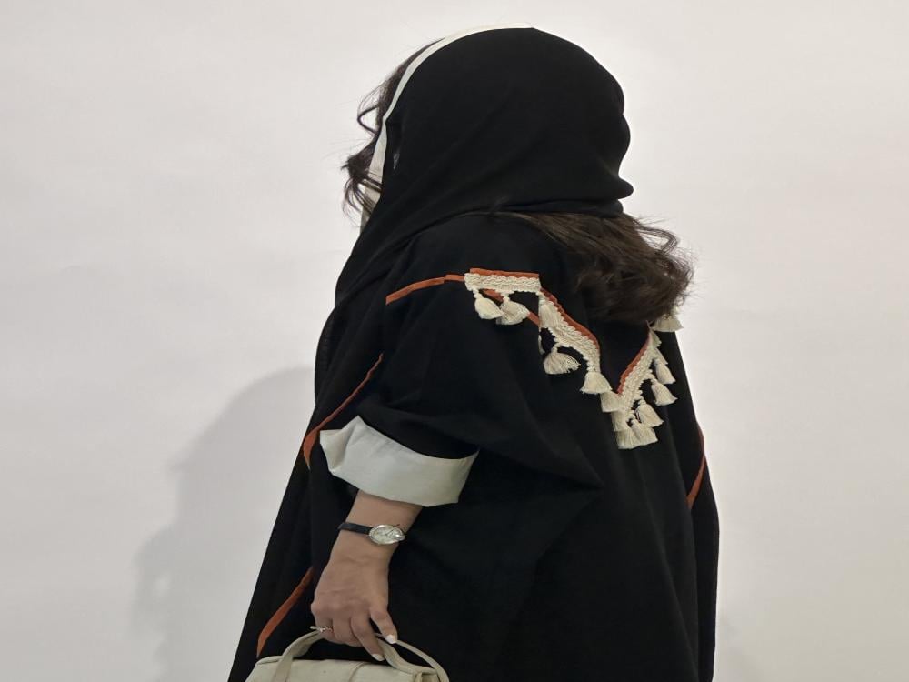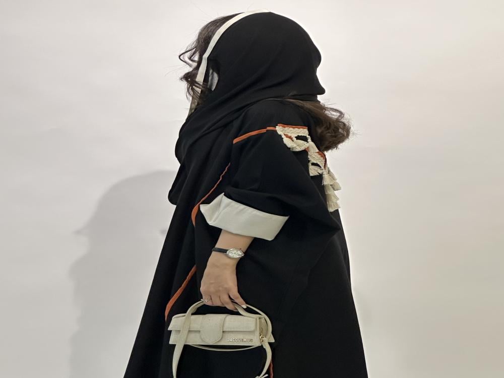 ستايل العبايه بوهيمي/ القصة: نص بشت الاكمام واسعه/ القماش: لنن / اللون اسود مع بيج مع برتقالي / الطرحه شيفون اسود طرف لنن بيج
