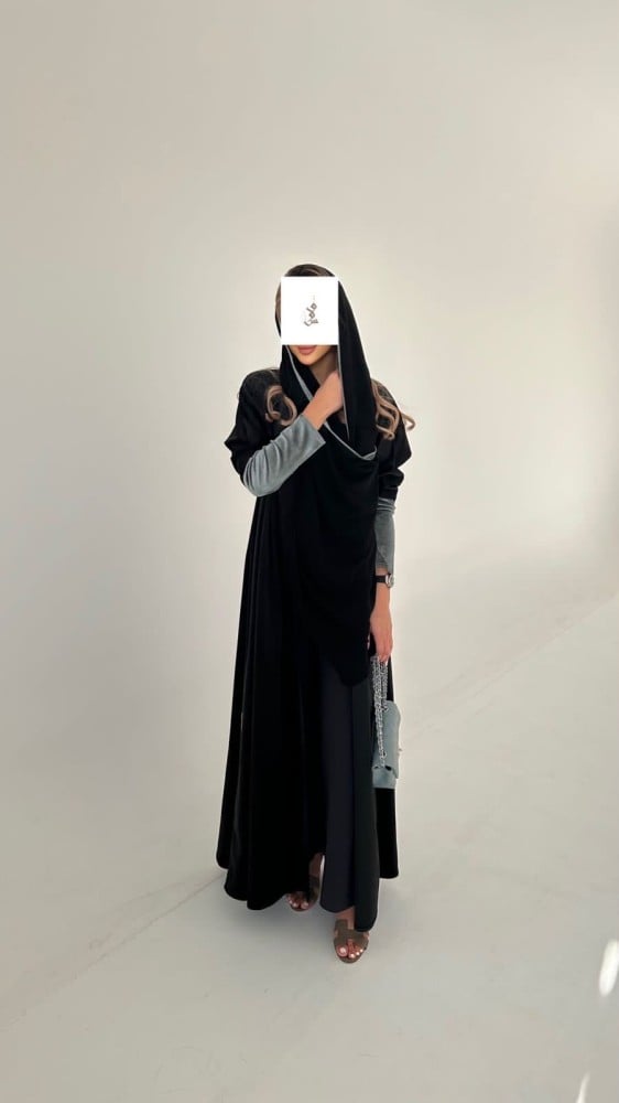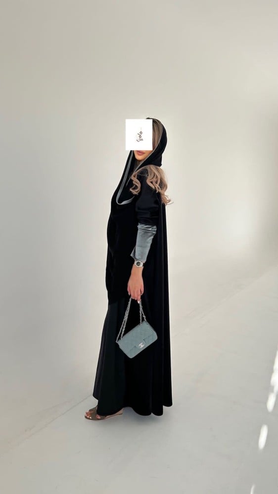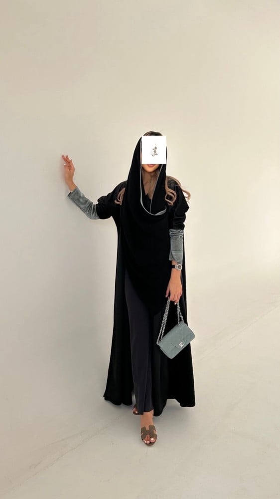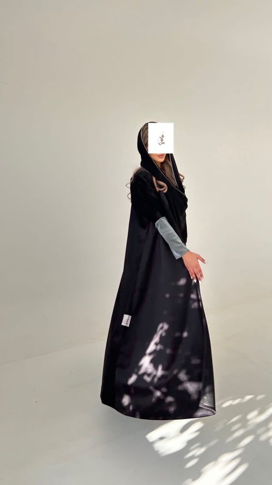 . عباية كلوش من خامة شامواه مخمل خفيف الكوري باللون الاسود و اكمام سترتش.