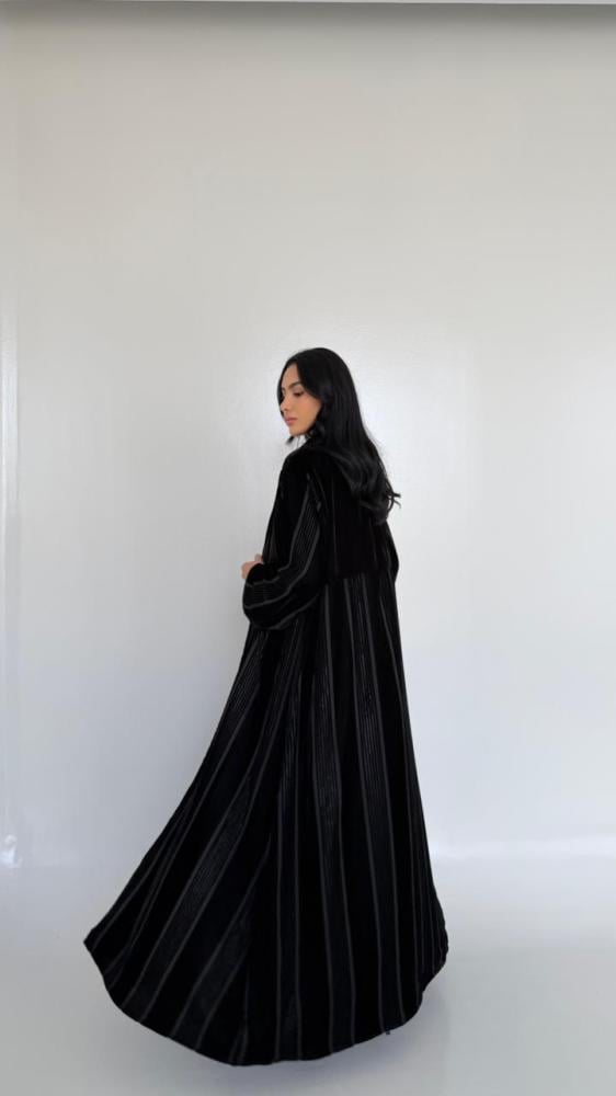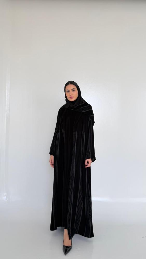 • مخمل كوري اسود ، شيفون مخطط مخمل نص كلوش مع فستان مخمل اسود ساده.• الطرحة نص شيفون ساده و نص شيفون مخطط مخمل.
