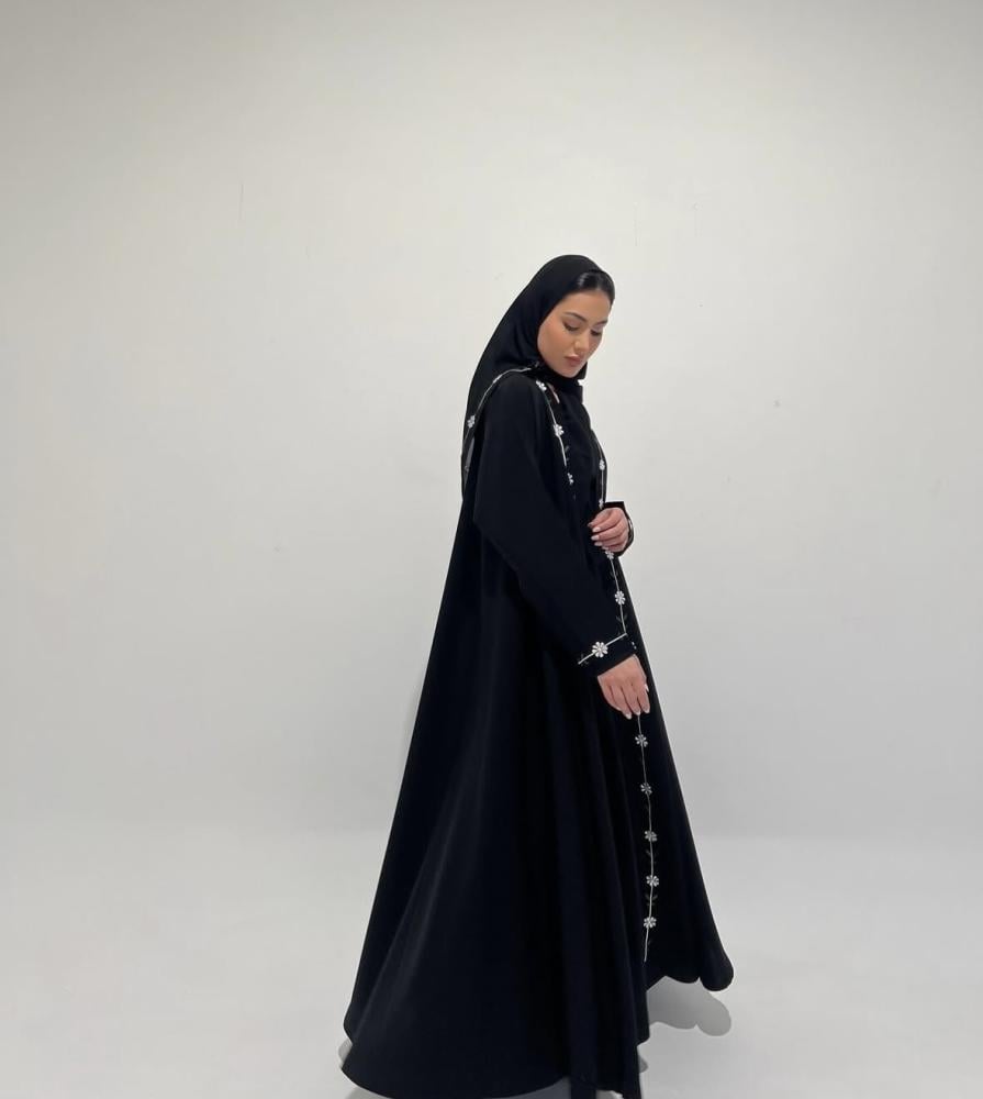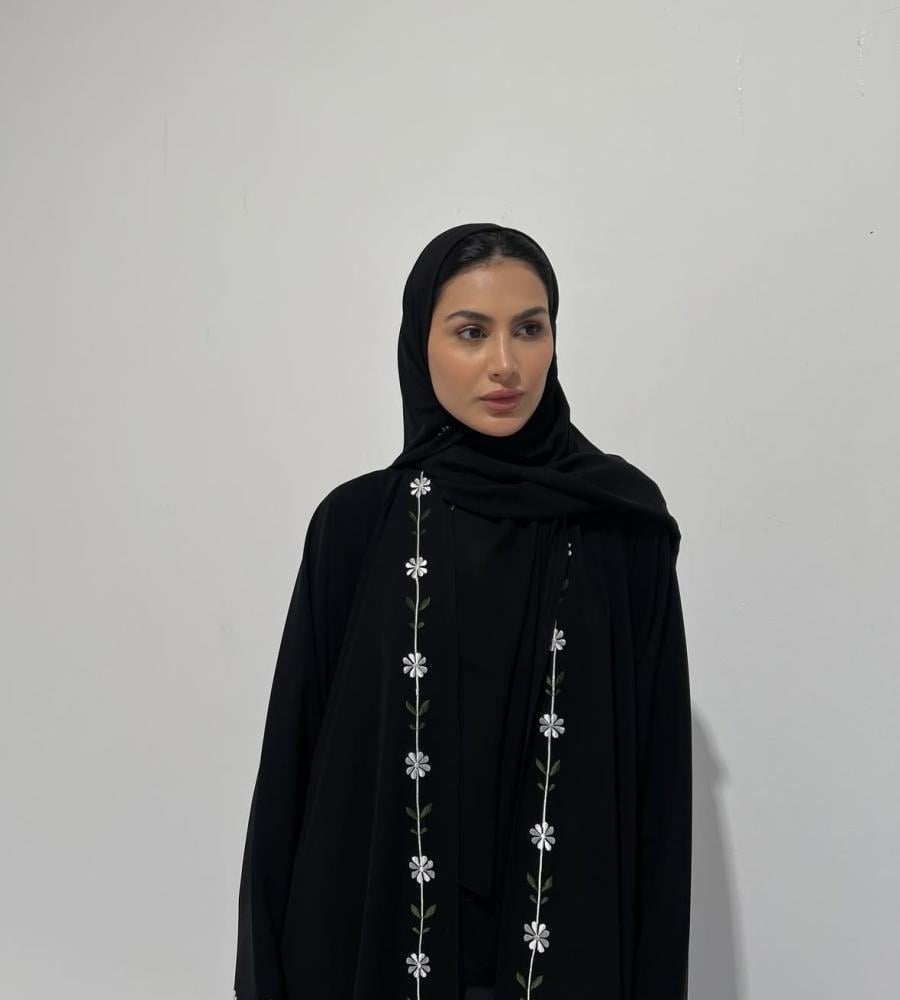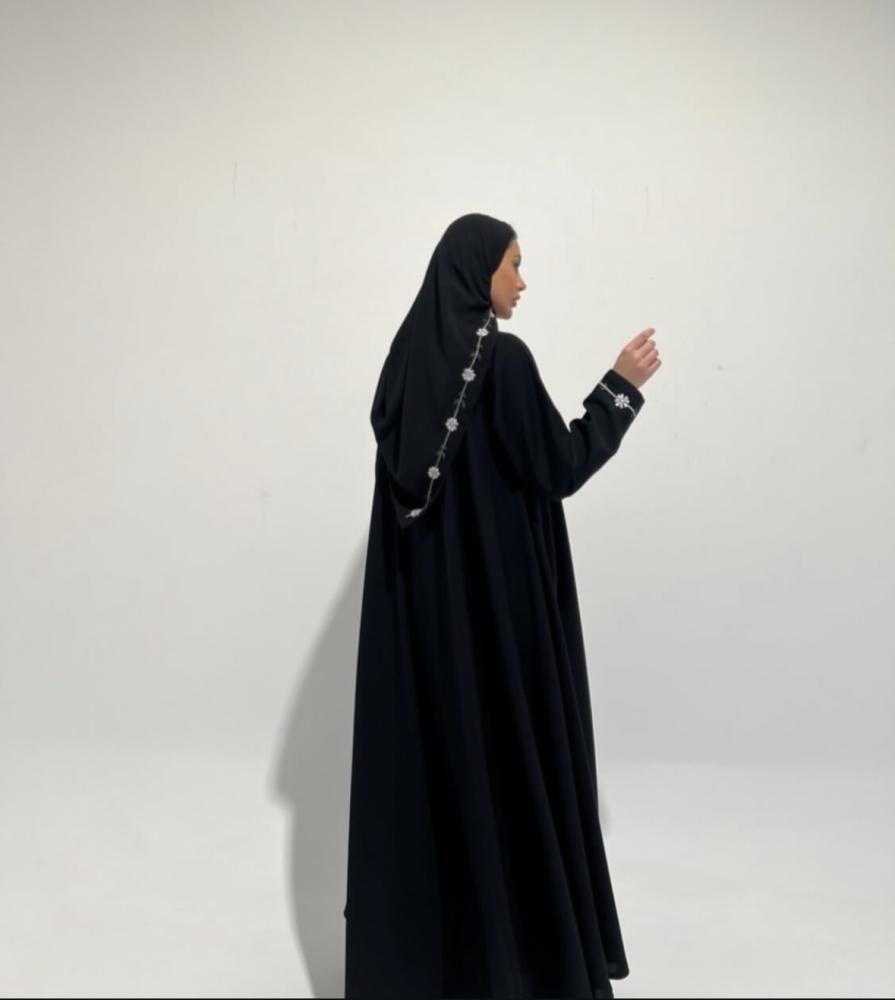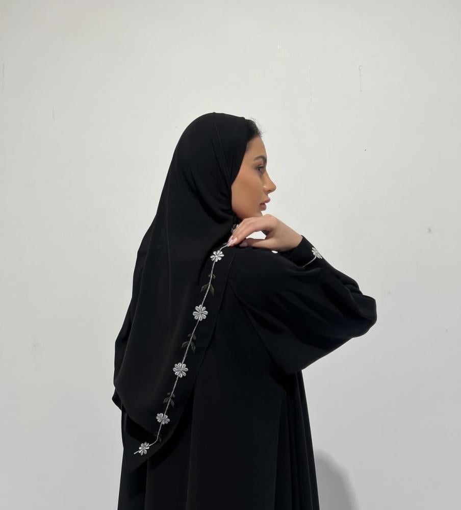 • عباية دبل كلوش كريب ياباني ، تطريز ورد ابيض و زيتي بالاكمام و بالامام للعباية و طرف الطرحة.