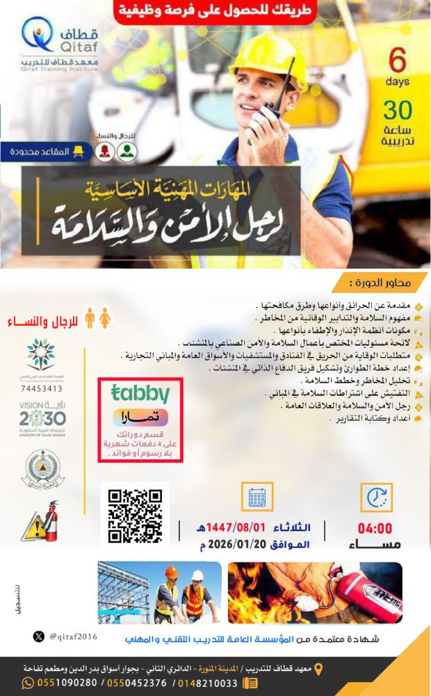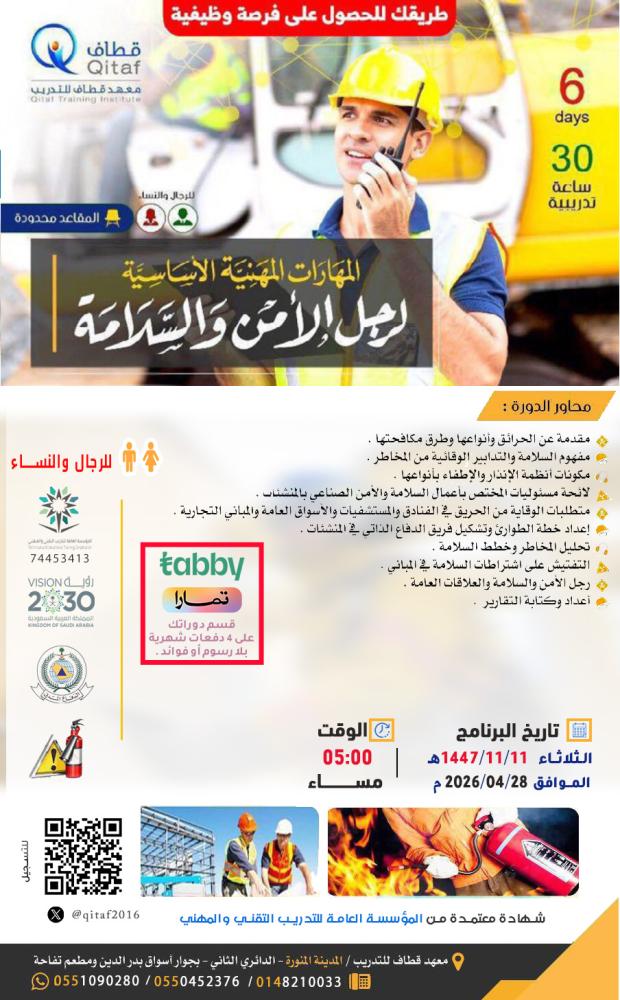 تنطلق هذه الدورة لتزويدك بالمهارات والمعارف الأساسية التي يحتاجها كل رجل أمن وسلامة للنجاح في بيئة العمل الحديثة. ستتعلم من خلالها مبادئ السلامة المهنية، التعامل مع حالات الطوارئ، الاتصالات الفعالة، التقنيات الوقائية والمراقبة، وإعداد التقارير بطريقة احترافية. عند الانتهاء، ستكون مجهّزًا بأدوات عملية لتعزيز الامتثال، حماية المنشأة، وبناء مسار مهني ثابت في قطاع الأمن والسلامة.