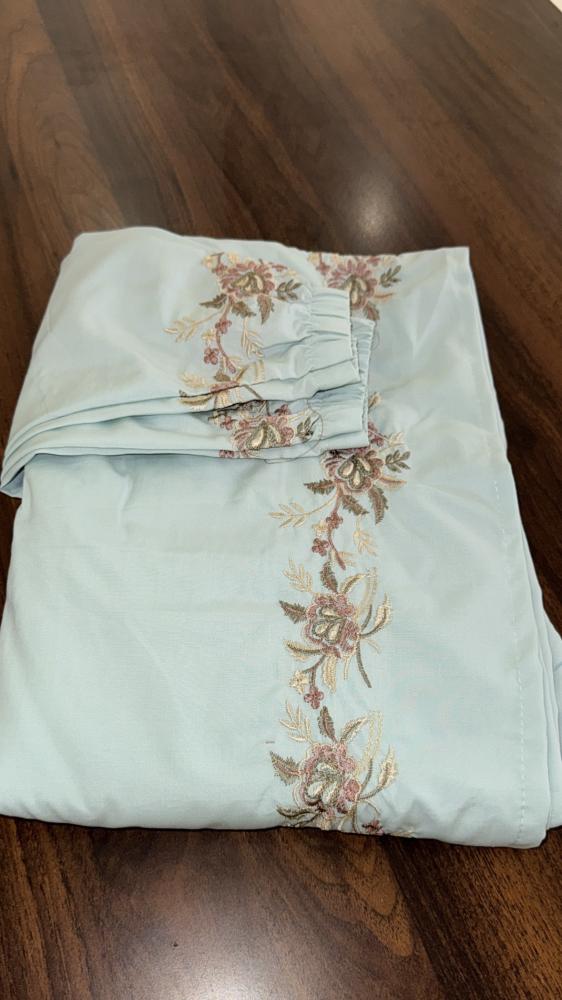 شرشف يجمع بين البساطة والأنوثة، بألوانه الهادئة وتصميمه الانسيابي، ليضفي لمسة من الرقة.