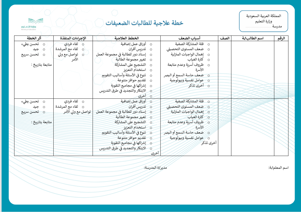 مع هذه الخطة العلاجية ستتمكنين من معالجة ضعف الطالبات بشكل فعّال، ومتابعة تطورهن بطريقة منظمة واحترافية.