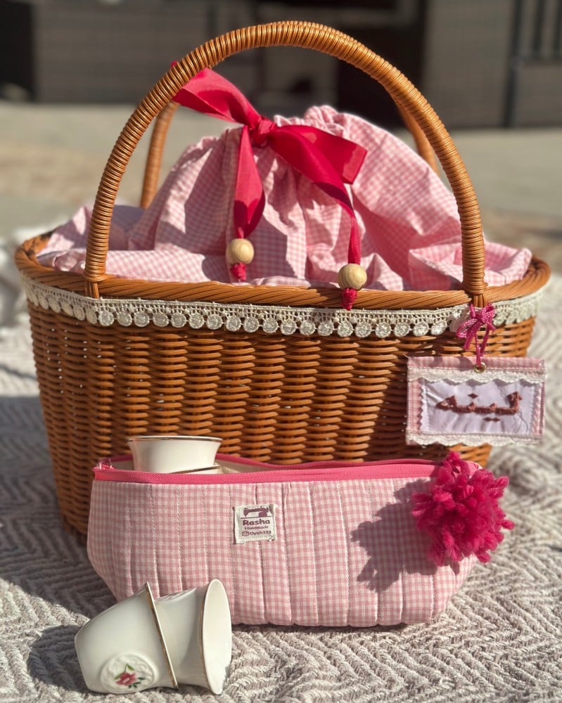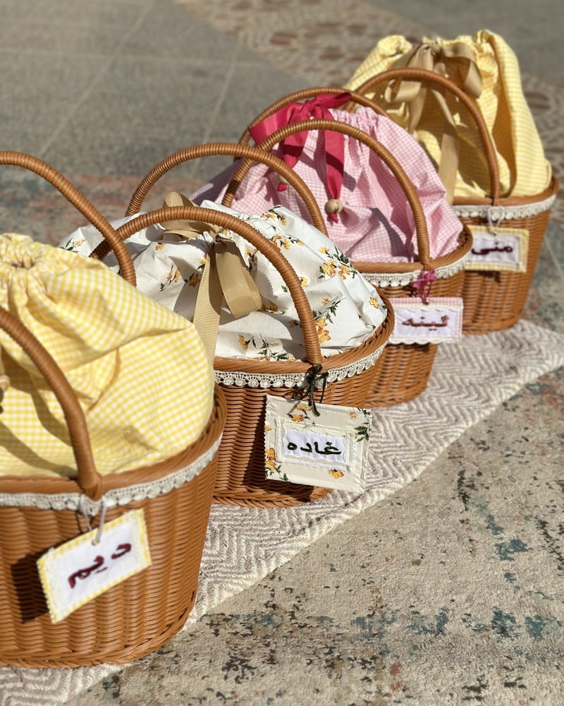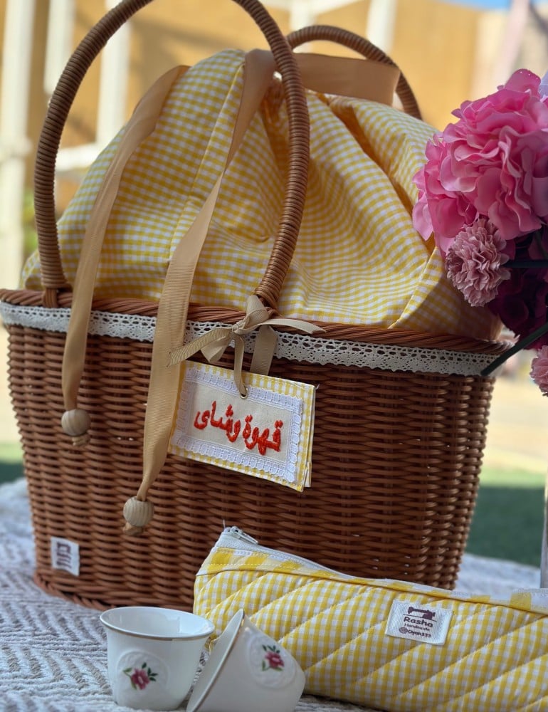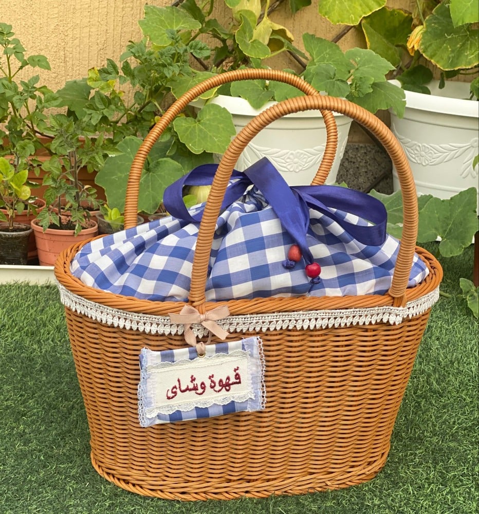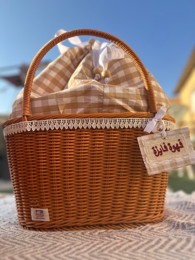 سلة قهوة من البلاستيك المقوى (خوص) مخيط بها تلبيسة قماشية من مع تاق تطريز بالأسم المختار عربي او إنجليزي