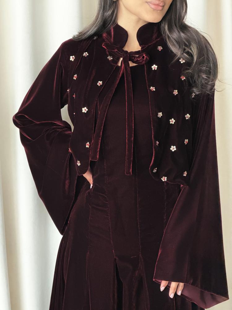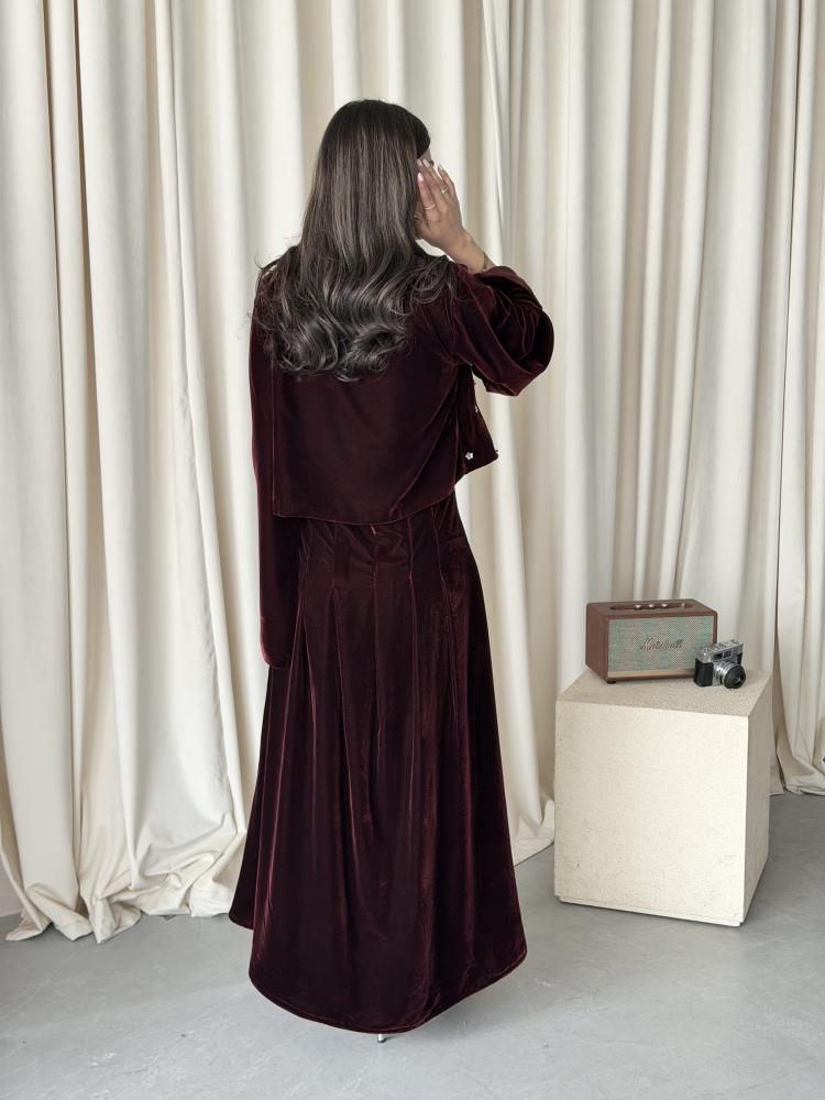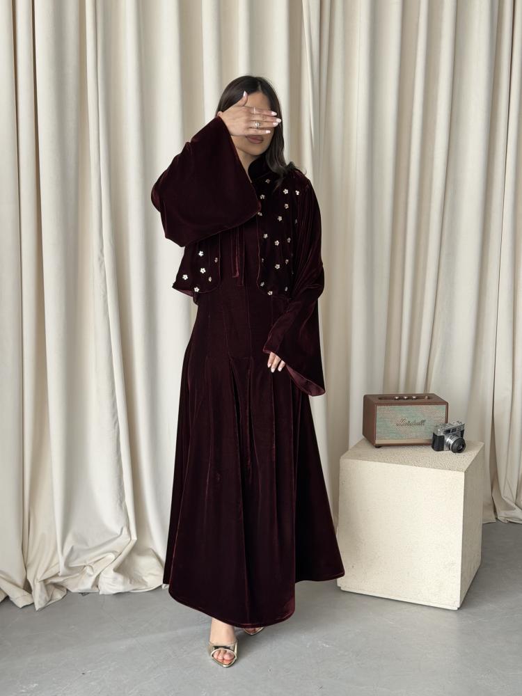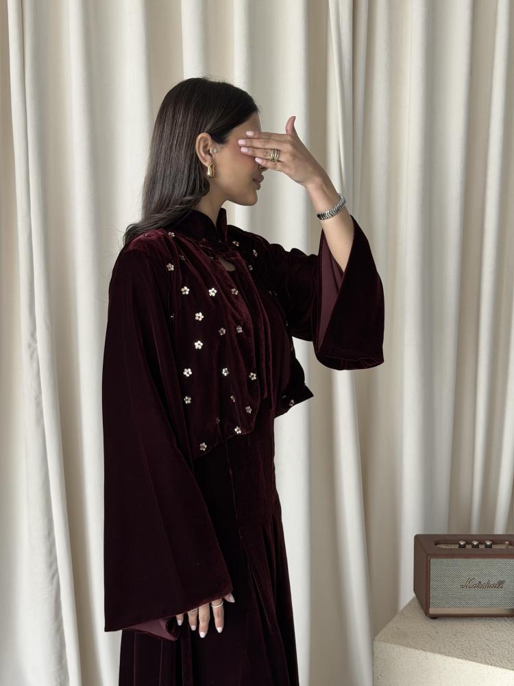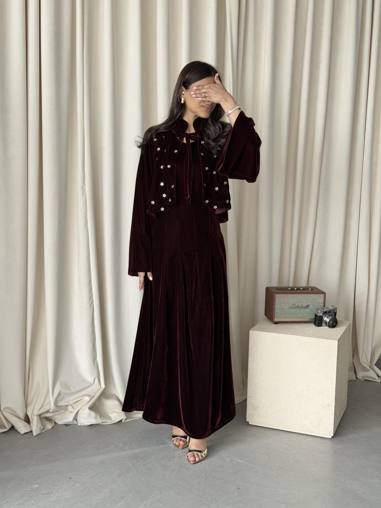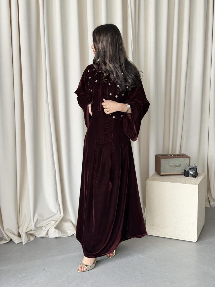 فستان مخمل عنابي بكسرات، مع إضافة قطعة بشك يدوي، متوفر بعدة ألوان.