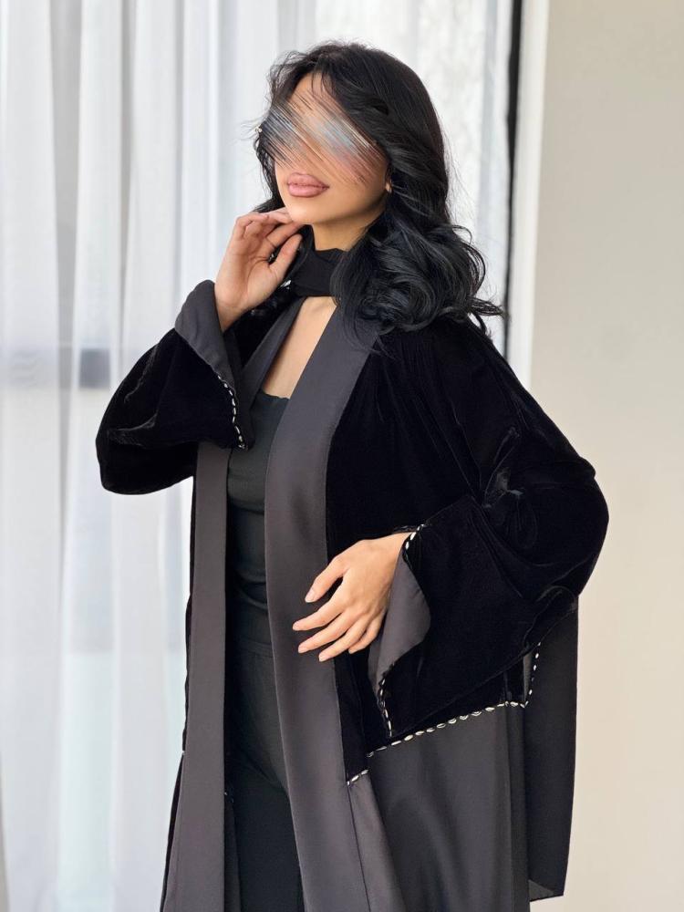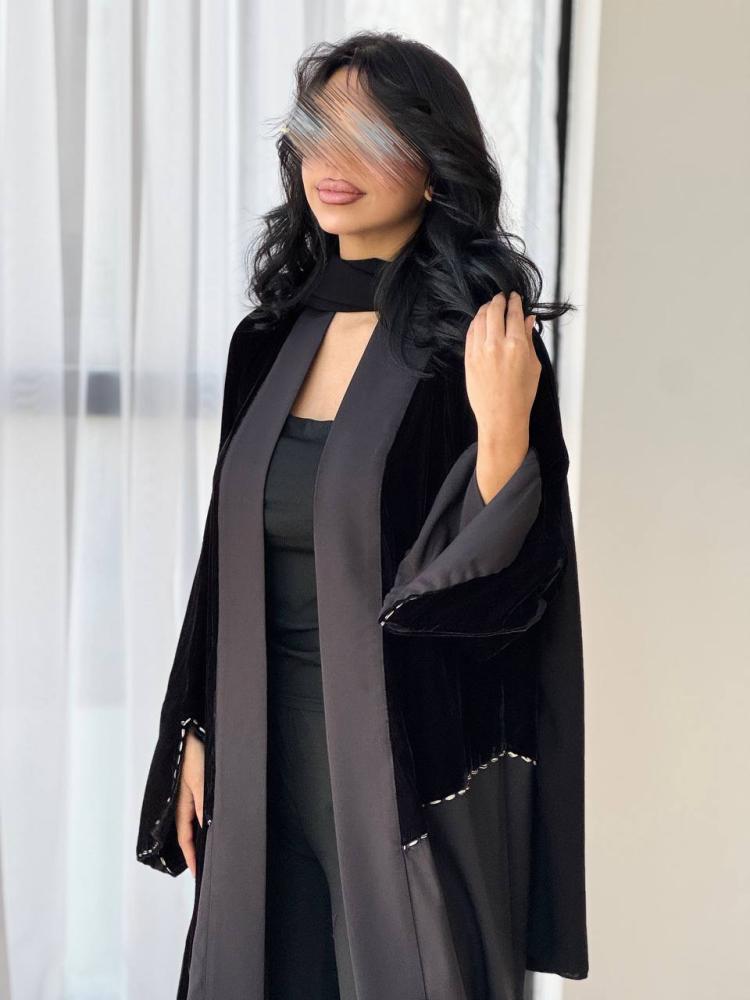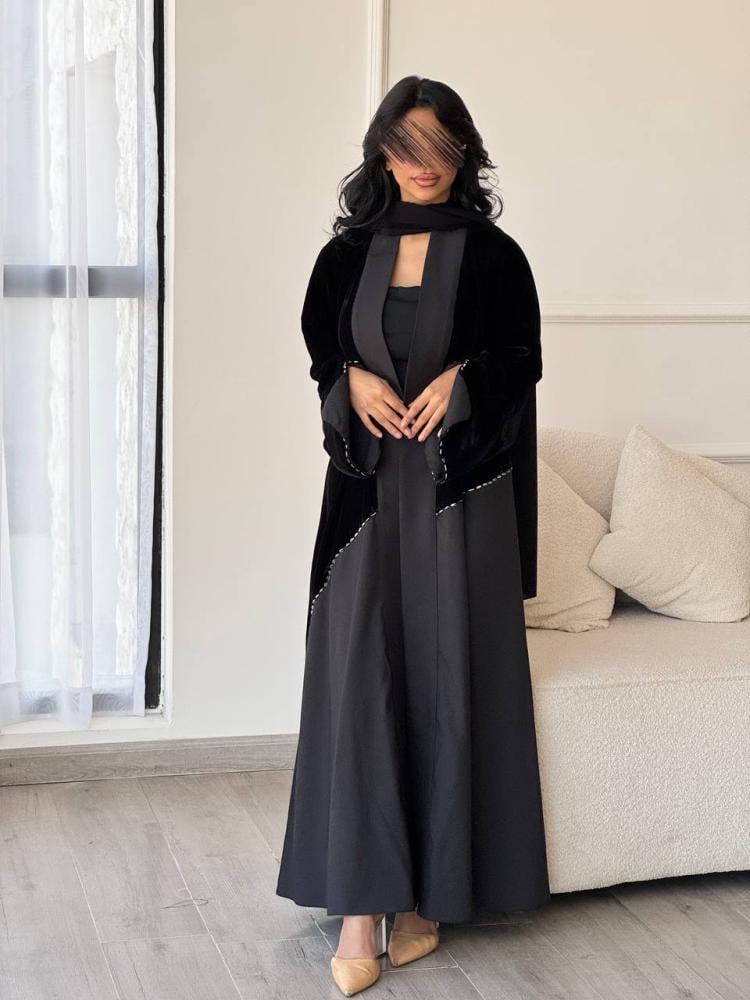 الخامة: قماش مخمل مع تفتة وتطريز يدوي على الطرحة والعباية