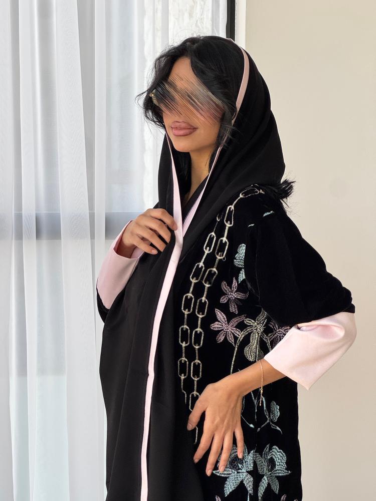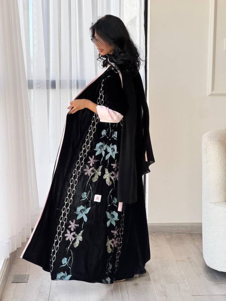الخامة: قماش مخمل سادة مع إضافة مخمل مطرّز وأكمام من تفتة وردية